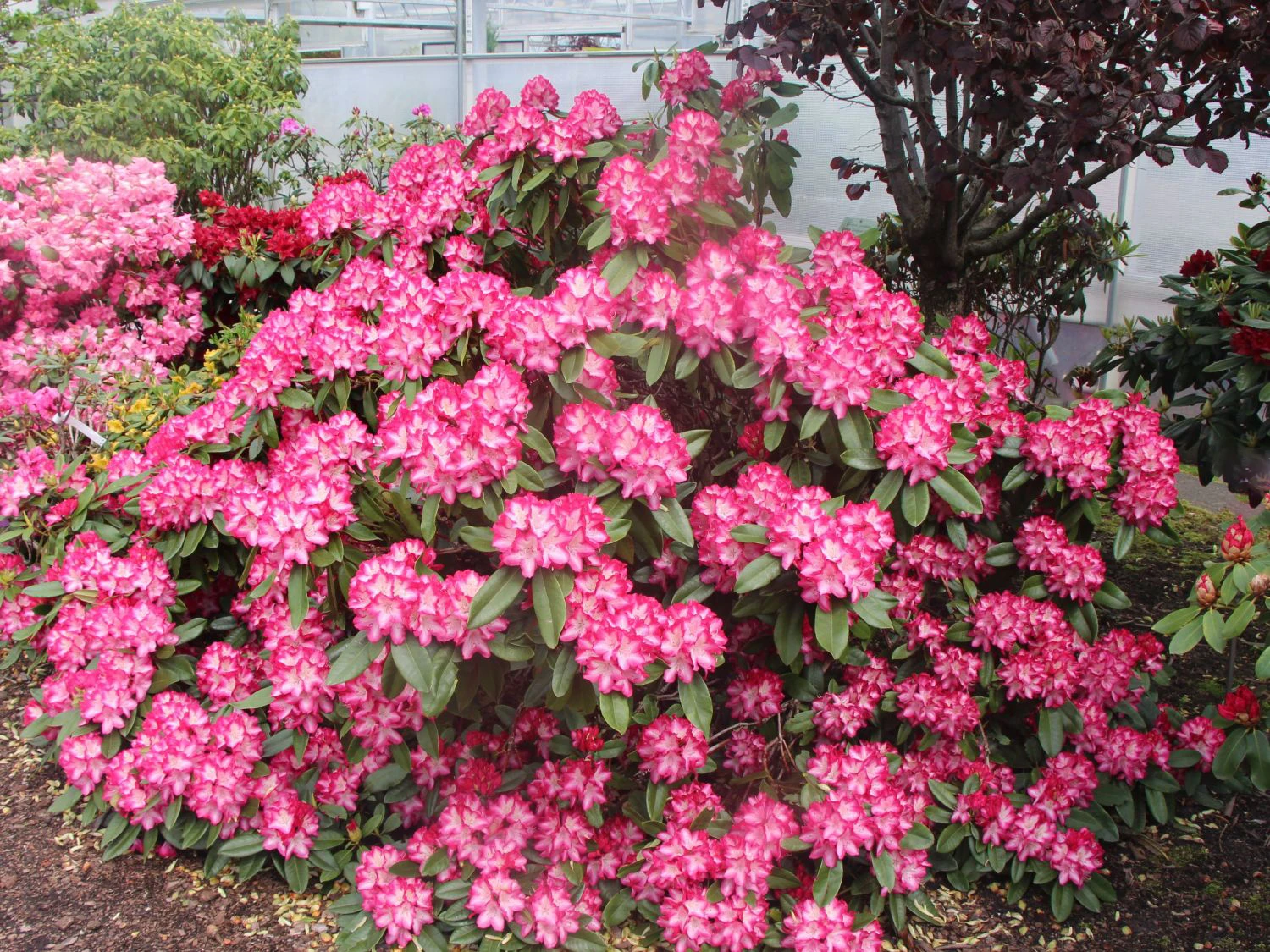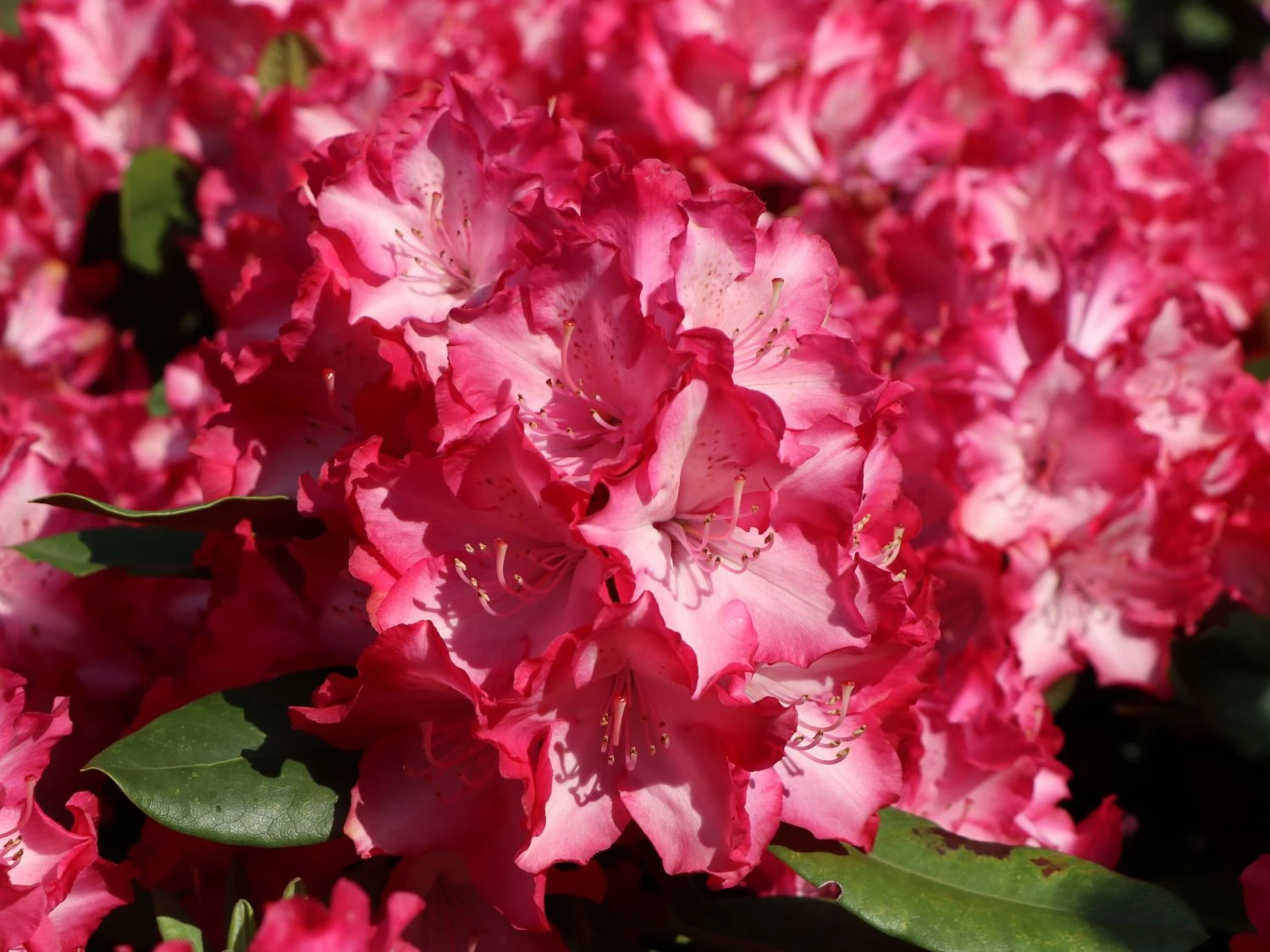 Die Blüten des Rhododendren „Eruption“ zeigen eine wunderschöne Farbkombination mit dem hellroten, gekräuselten Saum und einem weißen Inneren. Beim Ausreifen färbt sich das Weiß in ein zartes Rosa.