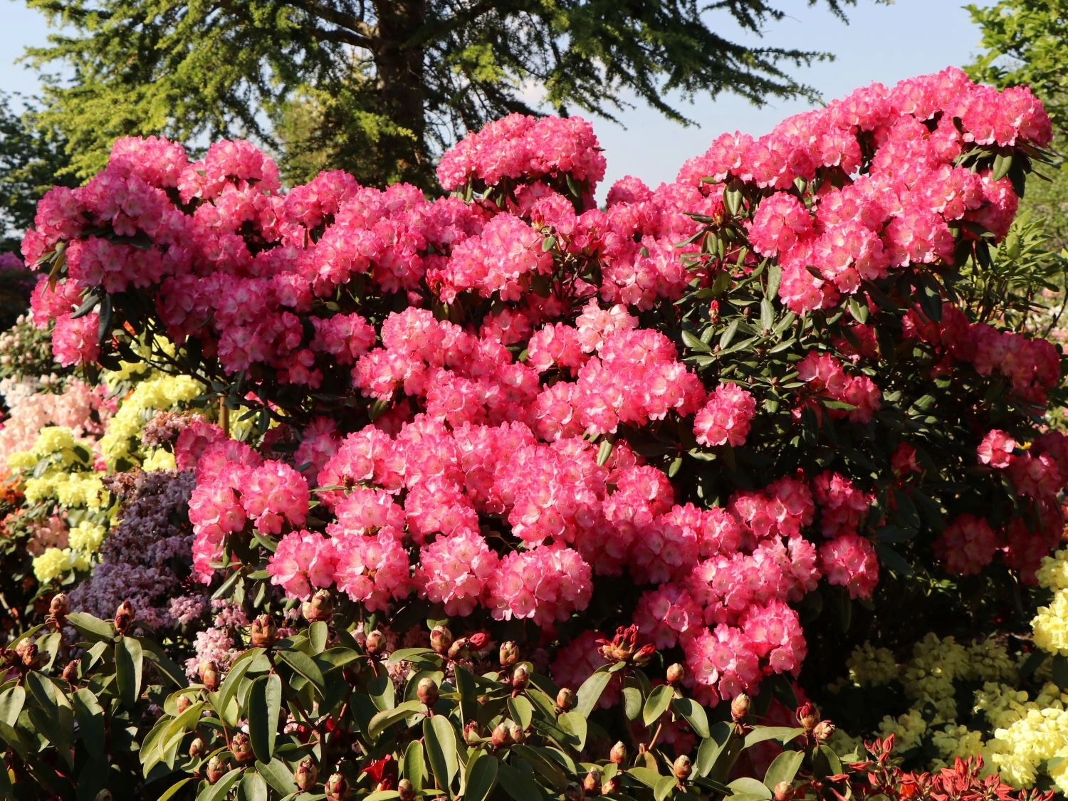 Der Rhododendron ‚Fantastica‘ gehört zu den schönsten rosarot blühenden Sorten. Geduld ist zunächst angesagt, denn der Zierstrauch blüht spät. Er zeigt sich von Ende Mai bis Anfang Juni in fantastischer Blütenpracht. Der (bot.) Rhododendron yakushimanum ‚Fantastica‘ bildet in dieser Zeit große rosarote Blütenbälle. Di e Blüten sind innen fast reinweiß und bieten ein großartiges Farbspiel. Die Blütenbüschel bestehen aus bis zu 18 Einzelblüten mit fantastischer Farbbrillanz. Diese kommt vor den dunkelgrünen Laubblättern besonders schön zum Ausdruck. Die Blätter sind länglich-eiförmig, ledrig und glänzend. Der Rhododendron wächst aufrecht, dicht und kompakt. Er erreicht eine Wuchshöhe von 100 bis 140 cm und eine ebensolche Breite. ‚Fantastica‘ ist eine Augenweide, ein fantastisch leuchtender Blickfang. Der immergrüne Strauch ist ein praktischer Sichtschutz und lässt sich vielseitig in Gärten, Vorgärten oder Parkanlagen einsetzen. Ob als Solitär oder als Hecke zusammen mit andersfarbig blühenden Rhododendren, ‚Fantastica‘ ist stets ein Highlight. Auch im Pflanzkübel macht er eine gute Figur und schmückt blütenreich Terrasse oder Balkon. Auch auf Friedhöfen, in Innenhöfen oder in Dachgärten setzt der rosarot blühende Rhododendron magische Akzente.