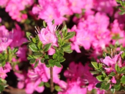 Der Rhododendron ‚Frosthexe‘ ist ein reizvoller Zwergstrauch, der mit seinem traumhaft schönen, reichen Flor und dem ansprechenden Laub begeistert. Seinen Namen verdankt er seiner frühen Blütezeit, die etwa von Mitte bis Ende April dauert. Die Blüten haben kein Problem mit Spätfrösten. Sie sind trichterförmig und setzen sich zu dichten, flachen Blütenstutzen zusammen. Ihre Außenseite zeigt ein rötliches Lila, während sie im Inneren kräftig Violett erstrahlen. Die Blütenblätter sind am Saum leicht gekräuselt. Das Ziergehölz (bot.) Rhododendron anthopogon x lapponicum ‚Frosthexe‘ zieht auch mit seinem zierlichen, immergrünen Laub die Blicke auf sich, das sich durch eine hervorragende Blattgesundheit auszeichnet. Seine Blätter sind lanzettlich geformt und ganzrandig. Ihr glänzend dunkelgrüner Farbton harmoniert perfekt mit der leuchtenden Blütenfarbe. Der Rhododendron ‚Frosthexe‘ wächst breit aufrecht und buschig, sein Habitus ist leicht rundlich. Er wird 40 bis 50 Zentimeter hoch und 40 bis 70 Zentimeter breit. Die Sorte wurde im Jahr 1979 von dem Züchter W. Reich vorgestellt.