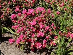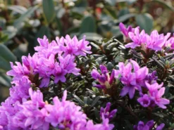 Der kompakte, aufrechte Wuchs des Rhododendron russatum ‚Gletschernacht‘ und sein immergrünes Laub macht allen Gärtnern eine Freude, die pflegeleichte Gewächse bevorzugen. Der Rhododendron ‚Gletschernacht‘ erreicht eine Wuchshöhe von circa 100 bis 120 cm, bei einer Wuchsbreite von rund 80 bis 110 cm. Als kleinerer Vertreter seiner Art, glänzt der Strauch als Teil einer schönen Gruppe. In Kombination mit anderen Sorten der Rhododendren oder Moorbeetpflanzen, wirkt ‚Gletschernacht‘ harmonisch arrangiert. Eine Japanische Azalee an seiner Seite gibt dem Arrangement den letzten Schliff. Auch als Solitär punktet der Rhododendron und zieht mit seiner faszinierenden Blütenfarbe die Blicke auf sich. Der Rhododendron bevorzugt ein saures Substrat und spezielle Rhododendronerde bietet die optimalen Grundlagen. Beim Einsetzen der Pflanze schließt die Oberkante des Wurzelballens im Idealfall mit dem Oberboden ab. Der Gärtner gießt den Rhododendron ‚Gletschernacht‘ kräftig an und sorgt mit einem Gießrand dafür, dass das kostbare Wasser nicht ungenutzt an den Wurzeln vorbei läuft. Der Strauch übersteht dank seiner Winterhärte von bis zu -24 °C die kalte Jahreszeit ohne Probleme. Falls der Gärtner seinen Rhododendron russatum ‚Gletschernacht‘ zurückschneiden will, wartet er bis zum Frühjahr. Dann treibt der Rhododendron nach dem Schnitt munter aus, sofern die kleinen Augen an den Ästen verbleiben. Bald darauf erfreut das immergrüne Gehölz mit violettblauem Blütenzauber.