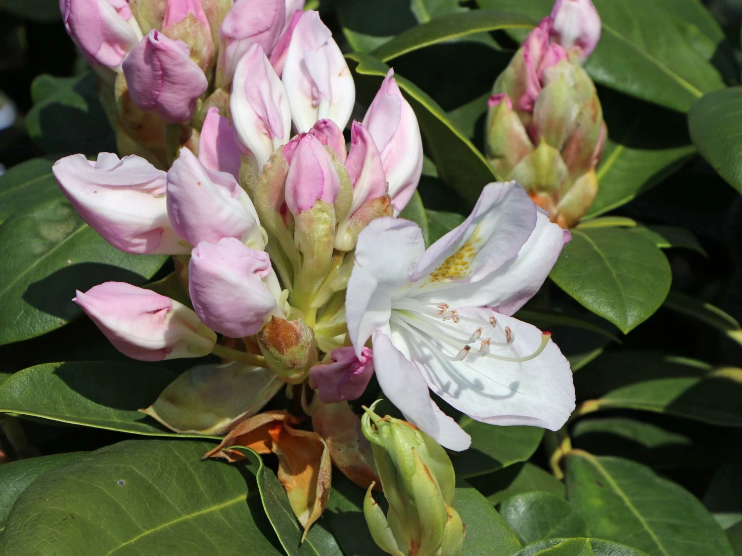 Die wundervollen Blüten zeigen sich in einem reinen Weiß. Die Blütenblätter sind in der Mitte gelbgrün gezeichnet und wirken ausnehmend elegant. Die Blütentage des Rhododendron ‚Gomer Waterer‘ liegen zwischen dem 30. Mai und dem 19. Juni. In dieser Zeit zieht das herrliche Blütenmeer die Blicke auf sich und verwandelt den Standort des Rhododendron Hybride ‚Gomer Waterer‘ in ein kleines Paradies. Begeistert bleibt der Gärtner vor den Blüten mit ihrem hübschen Auge stehen. Auch Bienen und Hummeln erfreuen sich am Blütenflor und umschwirren das Ziergehölz in großer Zahl. Ist der Flor verblüht, entfernt ihn der Pflanzenfreund um die Ästhetik des Strauches zu erhalten. Dann lenkt nichts mehr vom zauberhaften grünen Blattschmuck der Pflanze ab. Die Blätter sind breit und ellipsenförmig und zeigen einen Glanz, der ihnen eine elegante Optik verleiht. Auch tiefe Temperaturen haben dem schönen Laub nichts an. Diese Rhododendron-Sorte ist ausgezeichnet winterhart und verträgt Fröste bis zu -20 °C. Daher ist ein spezieller Winterschutz nicht erforderlich. Lediglich bei neu gepflanzten Exemplaren erwägt der Gärtner einen Schutz des Wurzelbereichs vor Kälteschäden. Eine dicke Schicht Rasenmulch oder Tannenzweige und Laub empfehlen sich. Eine solche Schicht hält gleichermaßen die Feuchte im Boden und vermeidet ein Austrocknen der Wurzeln.