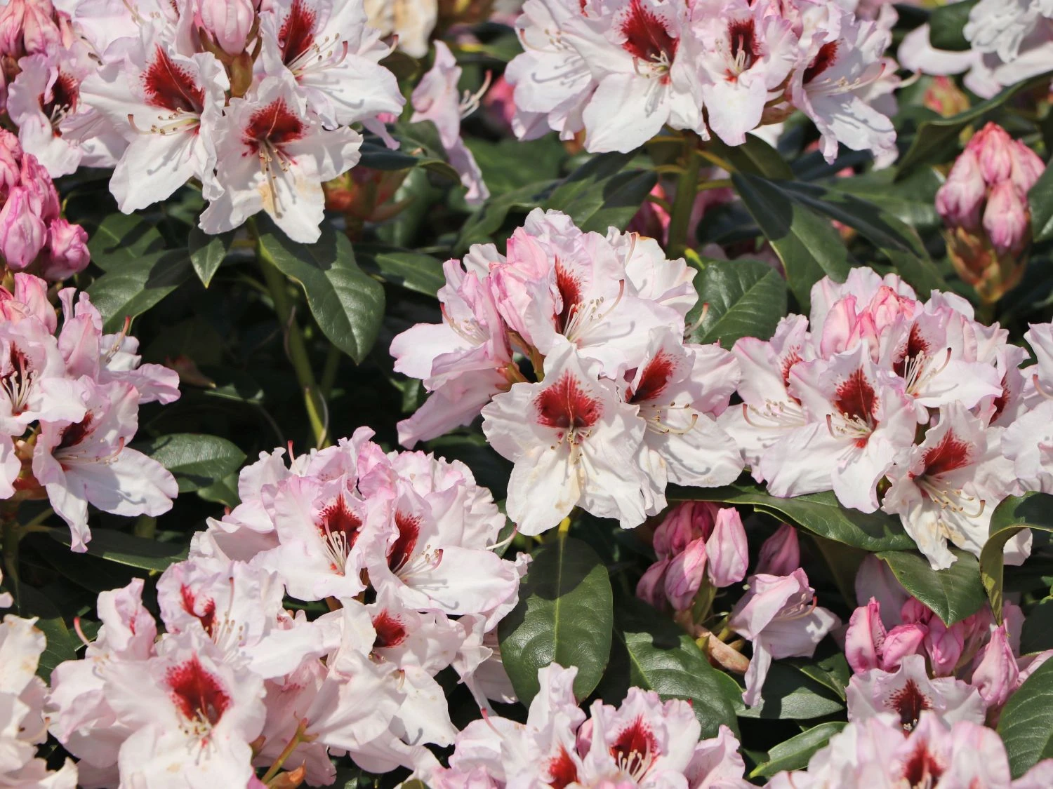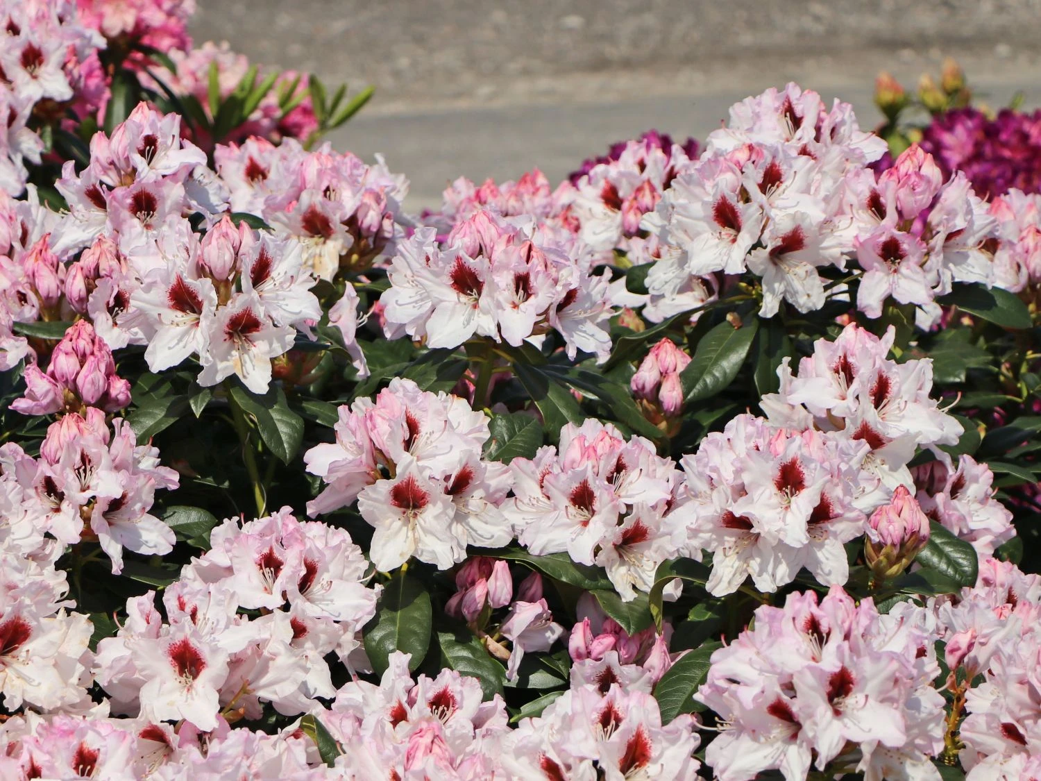Der Rhododendron ‚Graffito‘ ® bietet mit seinen rosigweißen Blüten einen fantastischen Anblick im Frühsommergarten. Der Zierstrauch stammt aus dem Jahr 1998 und erhielt bisher zahleiche Auszeichnungen. (Bot.) Rhododendron Hybride ‚Graffito‘ ® blüht von Anfang bis Mitte Juni und zählt damit zu den spät blühenden Sorten. Die hellrosa Blüten stehen in dichten Büscheln an den Trieben. Das Besondere ist die brombeerfarbene Zeichnung, die das jeweils obere Kronblatt einer Blüte schmückt. Die Leuchtkraft der Blüten ist bei der Sorte ‚Graffito‘ ® phänomenal, besonders wenn der Strauch im Halbschatten steht. Auch sonnige Standorte verträgt die Pflanze ohne Probleme. Der Rhododendron ist vielseitig und schmückt Beete, Rabatten oder Innenhöfe. Traumhaft schön kommt das Ziergehölz als Solitär zur Geltung oder im Innenhof in einer Kombination mit Bambus oder Kiefergewächsen. Auch im Kübel macht der Rhododendron ‚Graffito‘ ® eine exzellente Figur auf Balkon oder Terrasse. Die Pflanze erreicht eine maximale Wuchshöhe von 120 bis 160 cm und wird zwischen 140 und 180 cm breit.