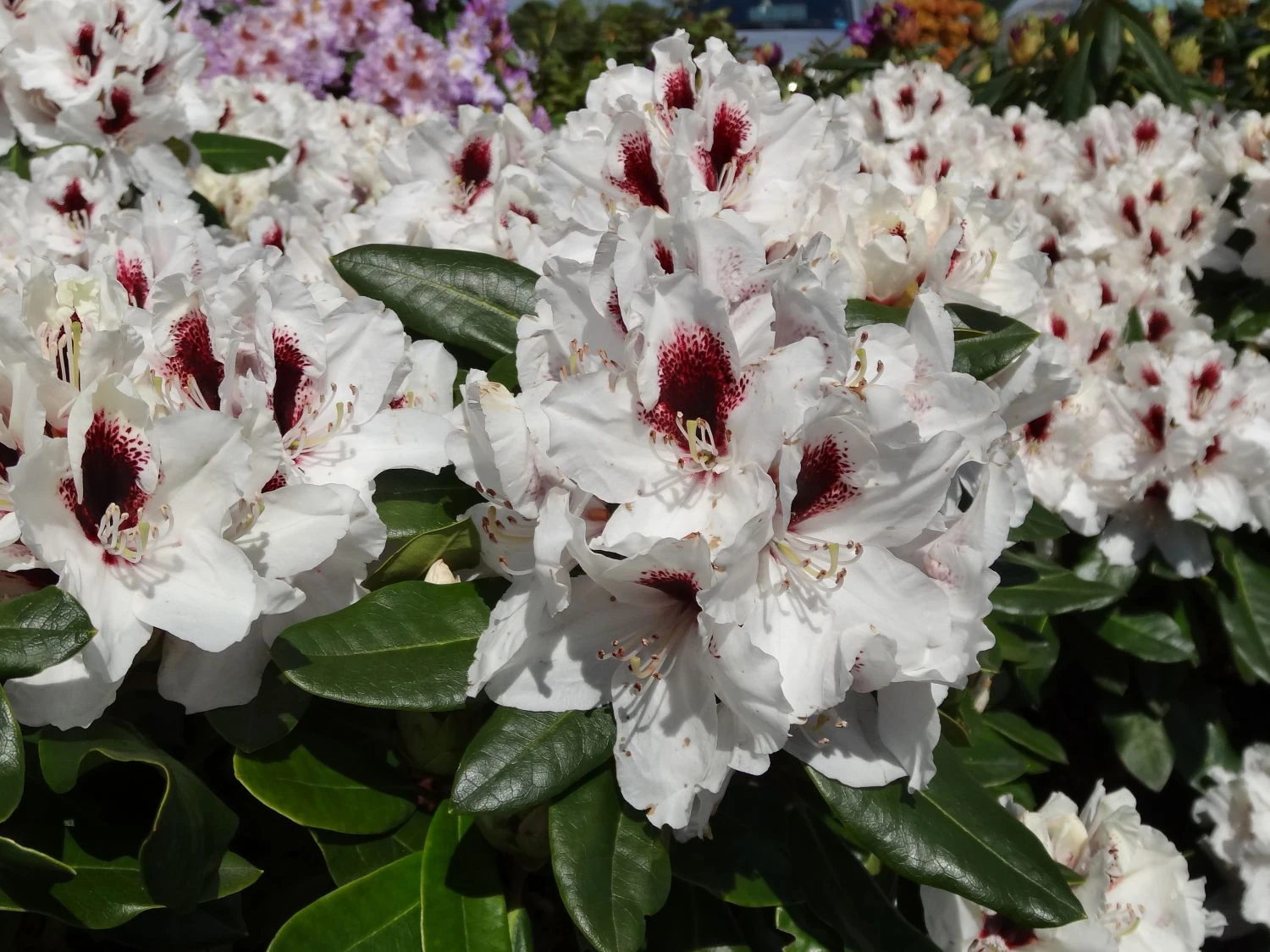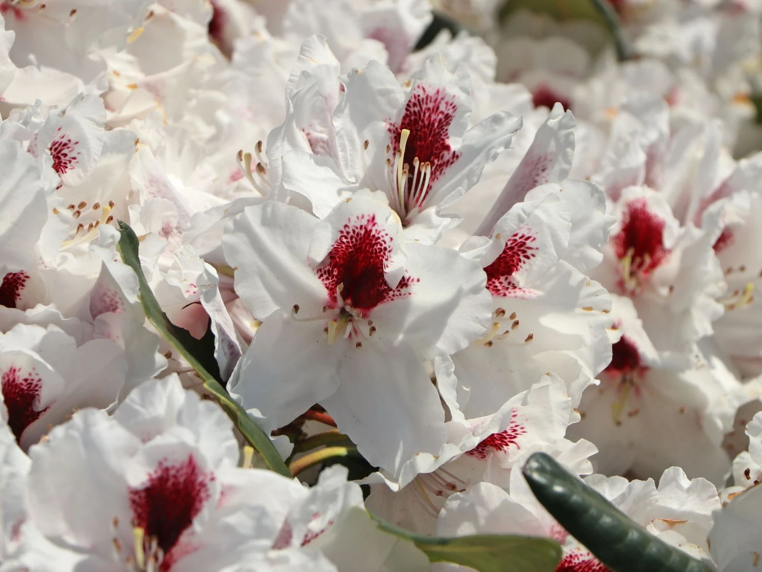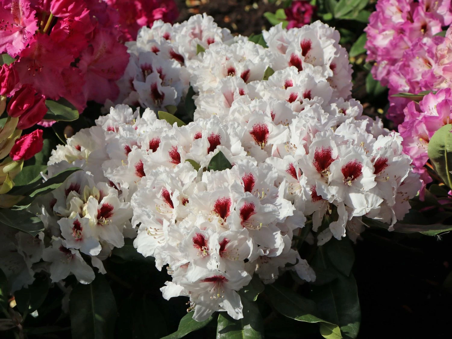 Der Rhododendron ‚Hachmann’s Picobello‘ (R) ist eine kleinwüchsige und kompakte Sorte mit großen weißen Blüten. Der Saum der bis zu 10 cm großen Blüten ist gekräuselt. In einer Zeit, in der viele andere Rhododendren bereits verblüht sind, beginnt ‚Hachmann’s Picobello‘ (R) erst mit seinem großen Auftritt. Ende Mai ist es soweit, dann präsentiert dieser Rhododendron bis in den Juni seine großartigen Blüten. Der Rhododendron Hybride ‚Hachmann’s Picobello‘ (R) ist erst seit 2004 auf dem Markt und hat seitdem bereits unzählige Liebhaber gefunden. Die weißen Blüten schmückt ein tiefrotes, fast dunkles Auge, was ihnen eine besondere Note verleiht. Das Laubkleid ist immergrün. Damit ist der Rhododendron ‚Hachmann’s Picobello‘ (R) ganzjährig dekorativ und blickdicht. Die Blätter sind dunkelgrün und glänzend. Sie sind elliptisch geformt und laufen vorn spitz zu. Sie sind der perfekte Hintergrund für die weißen Prachtblüten. Der Zierstrauch erreicht eine Wuchshöhe von rund 100 cm und wird bis zu 140 Zentimeter breit.