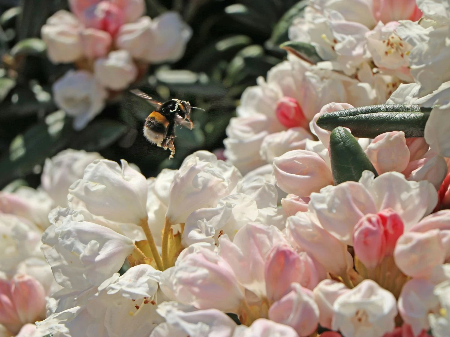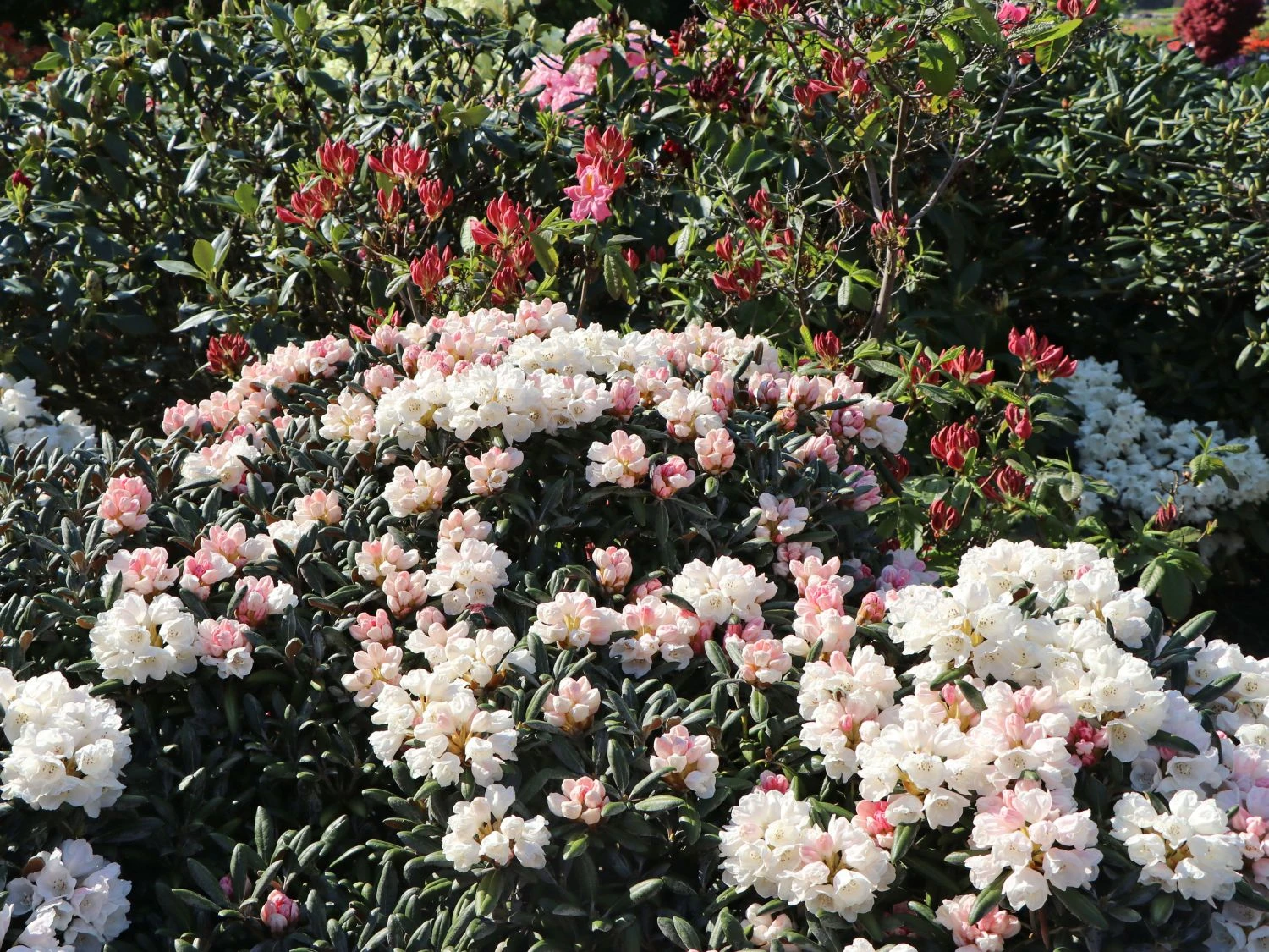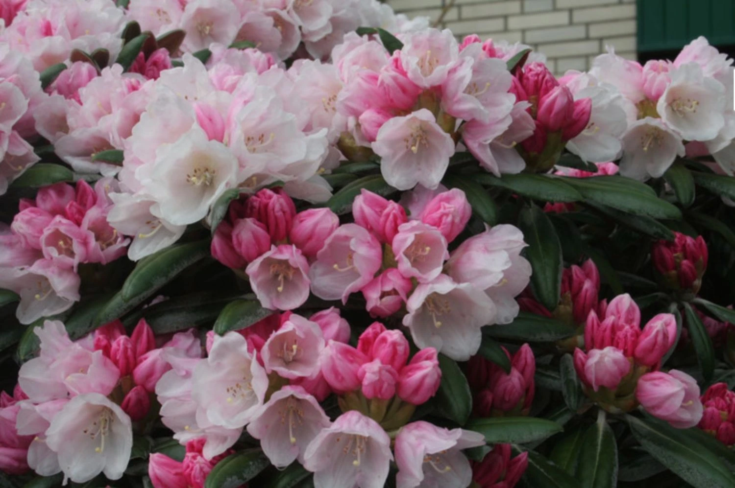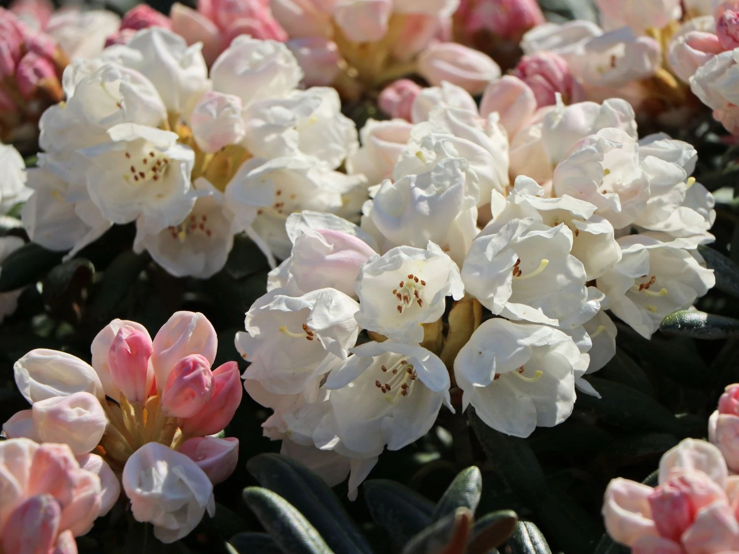 Rhododendron ‚Koichiro Wada‘ – Im Aufblühen haben die dicht gedrängten überhängenden Blütenbüscheln eine zartrosa Farbe. Später präsentiert diese Sorte ihr reinweißes Kleid. Der Durchmesser einer solchen Einzelblüte liegt zwischen 3,5 und 4,5 cm.
