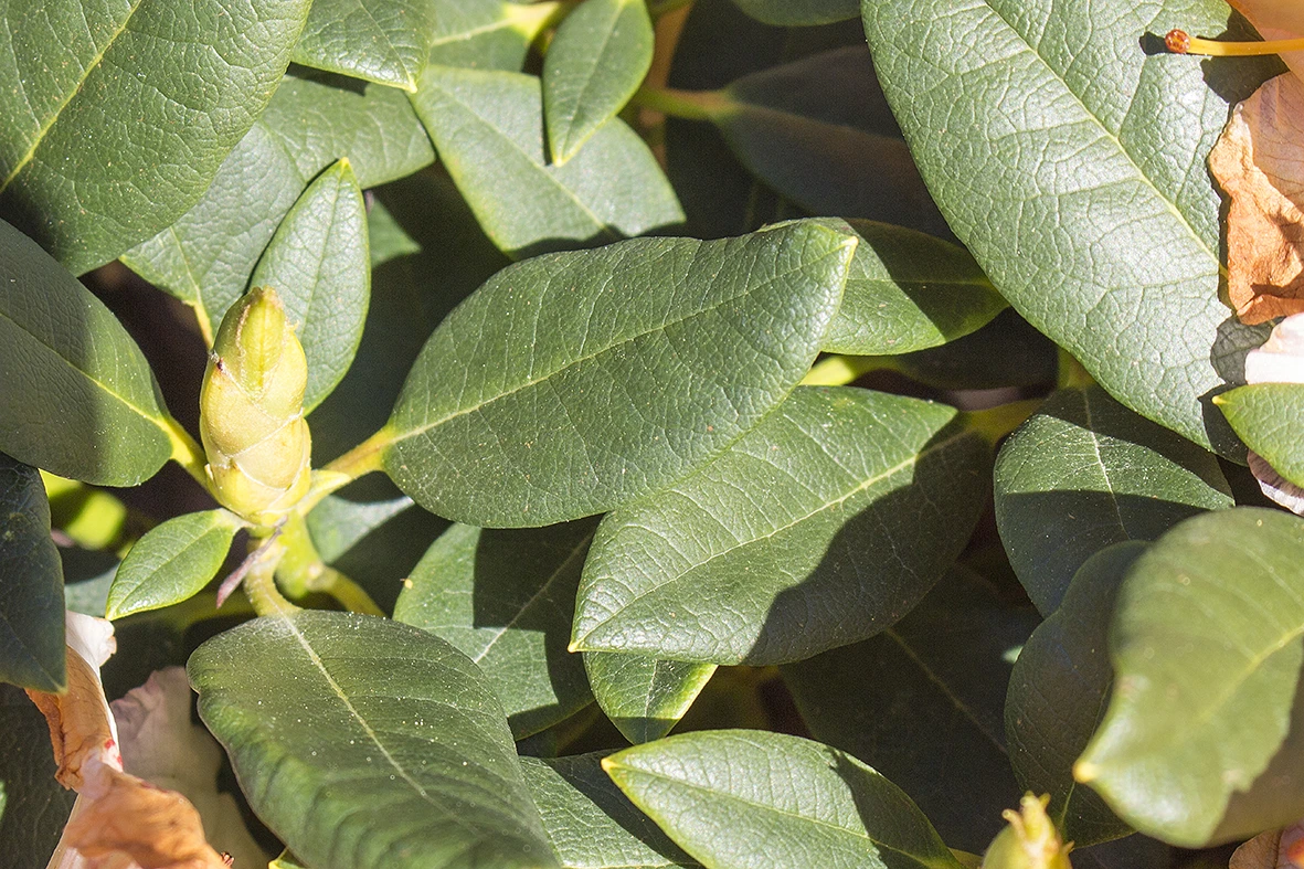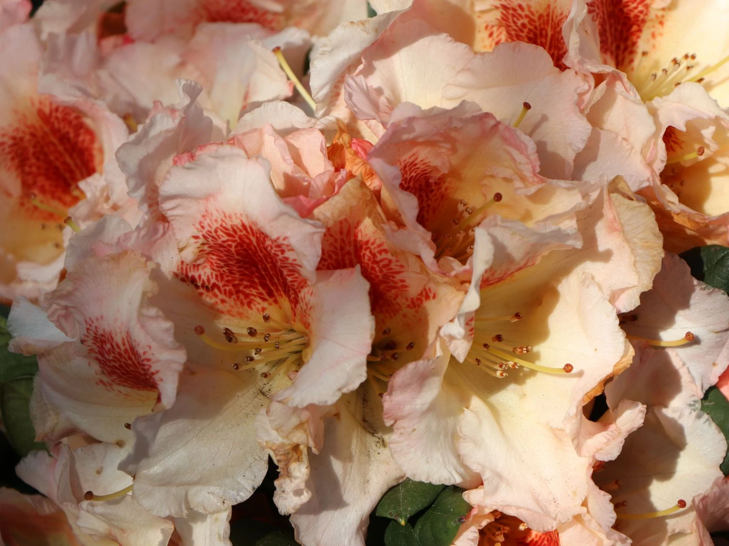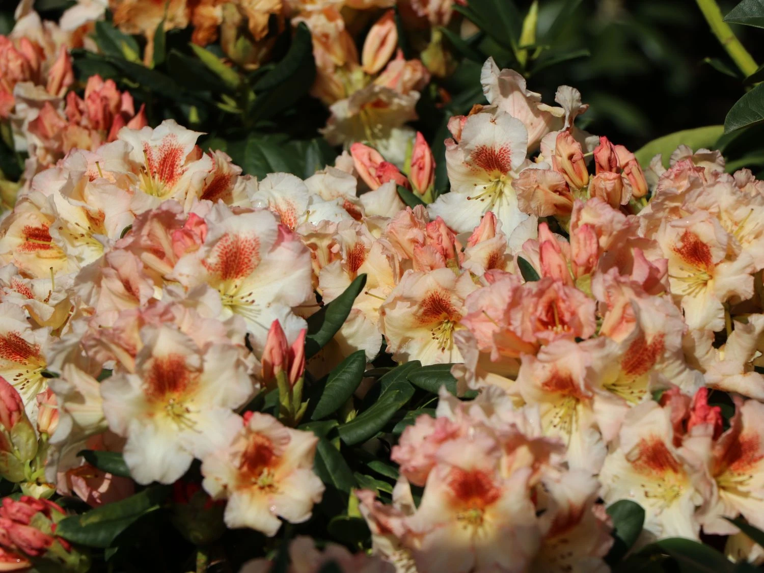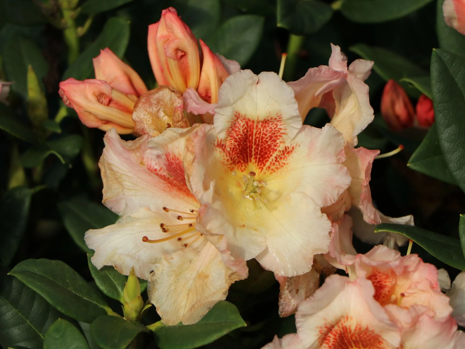 Der Rhododendron ‚Marylou‘ ist eine farblich eher dezentere Sorte. Ihre Blüten sind innen und außen cremegelb, die gewellten Ränder scheinen leicht rosa überstäubt. Auf den oberen Kronblättern zeigt sich effektvoll eine orangerote Zeichnung.