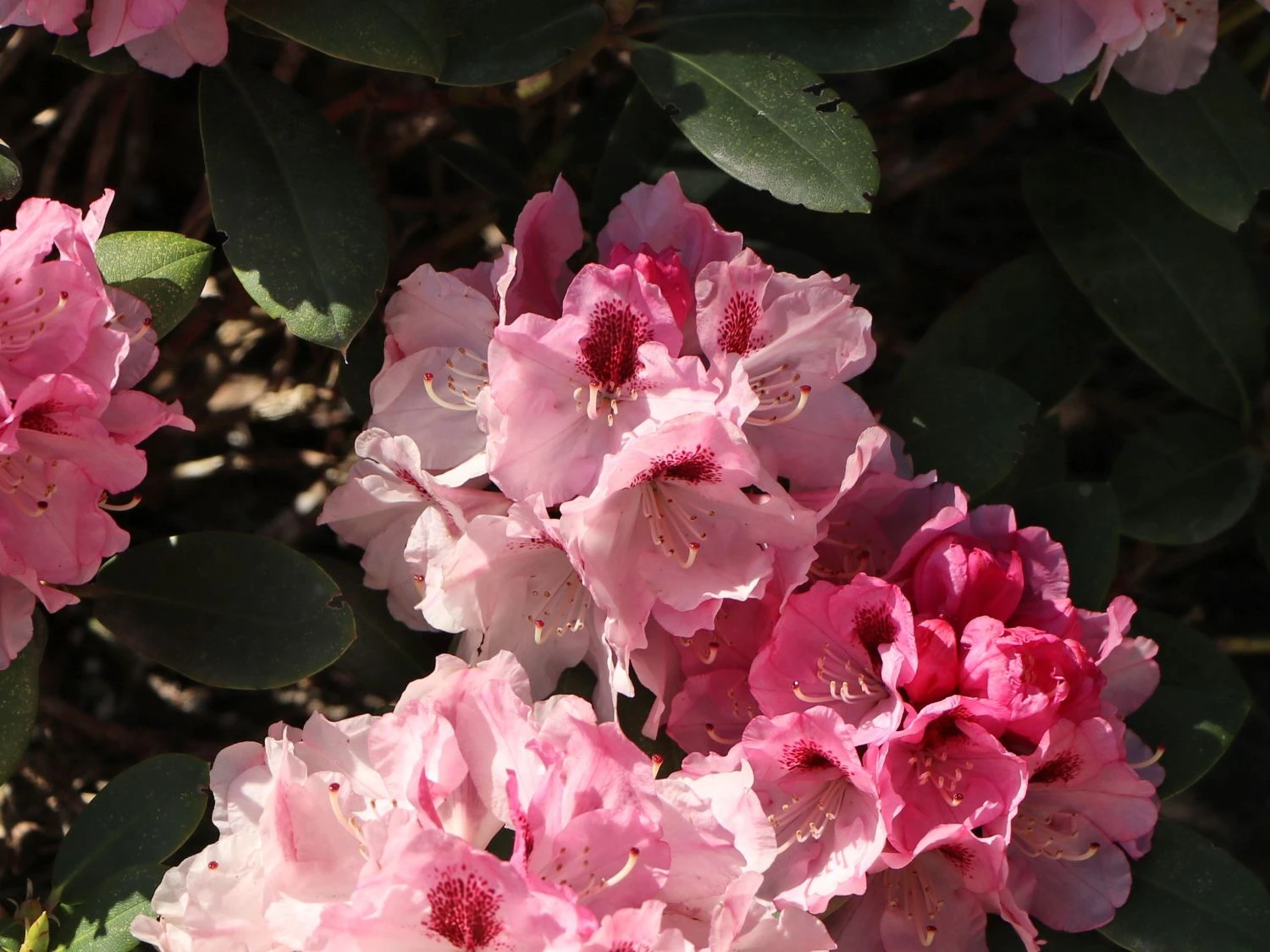 Rhododendron ‚Nicoletta‘ ® – Diese Züchtung ist im Aufblühen hellrosa, im weiteren Blühverlauf hellt sich dieser Farbton immer mehr auf, so zeigen sich die Blüten später in Weiß, daß mit einer brombeerfarbenen Fleckzeichnung geschmückt ist. Wer die Rosatönung gerne länger erhalten möchte, sollte sich für ‚Nicoletta‘ einen schattigen Standort aussuchen.