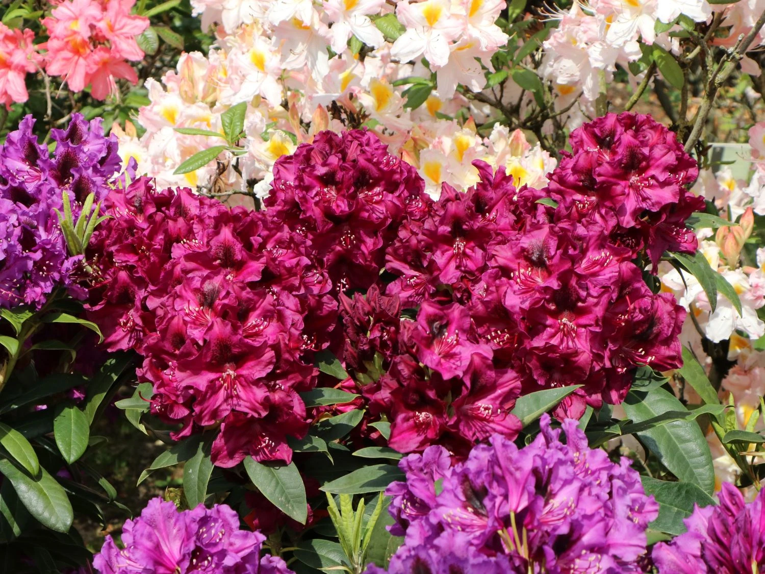So ein herrliches Weinrot wie der Rhododendron ‚Olin O.Dobbs‘ trägt sonst keiner. Die Blüten sind dazu noch purpurviolett getönt und mit einer brombeerfarbenen Fleckzeichnung geschmückt. Sehr apart wirken die leicht gewellten Blütenränder und die weinroten Staubfäden mit den cremeweißen Staubbeuteln.