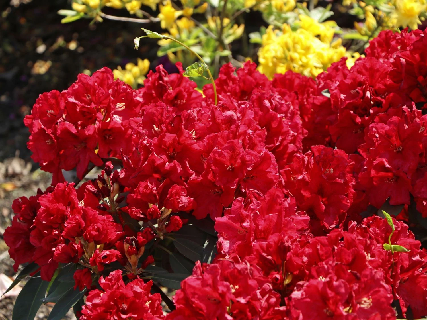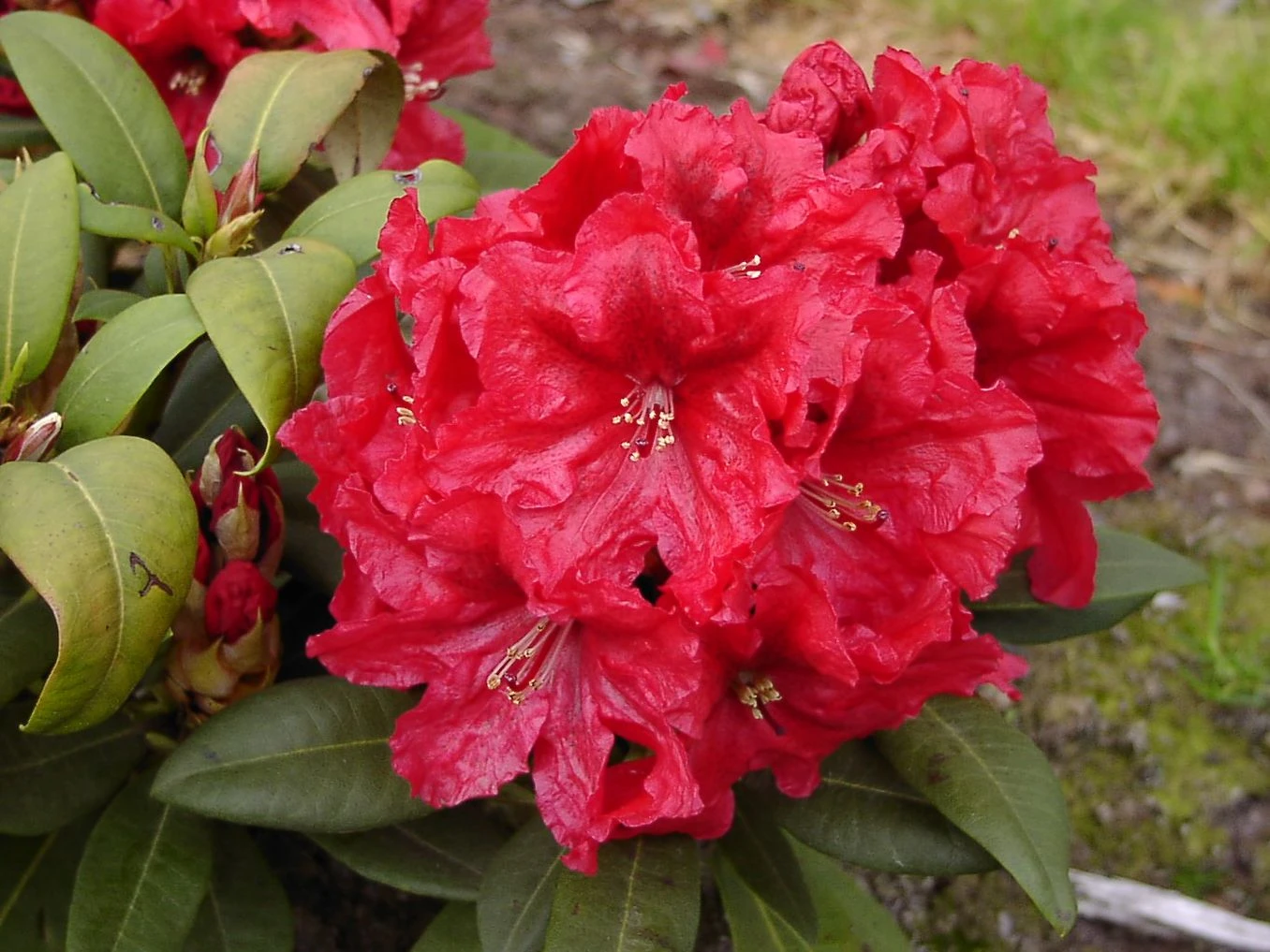 Rhododendron ‚Rabatz‘ – Eine herrliche reinrote Sorte. Die Blüten sind weitgeöffnet, so dass man sofort die imposante schwarzrote Fleckzeichnung auf den Kronblättern erkennen kann, die auf dem obersten Kronblatt am ausgeprägtesten ist. Die Säume der Blüten sind gekräuselt und gewellt.