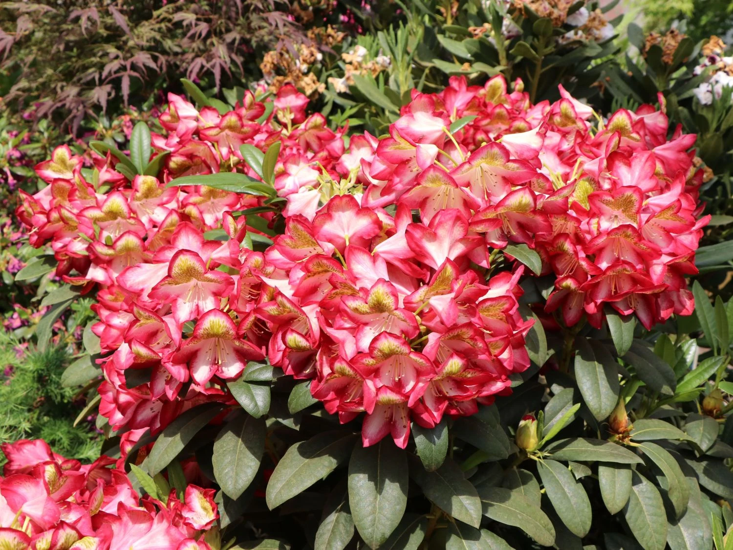Der Rhododendron ‚Raphaela‘ beeindruckt mit seinem unvergleichlich farbenfrohen und reichen Flor. Seine opulente Blütenpracht präsentiert er von Mitte April bis Anfang Mai. Bis zu 15 Einzelblüten setzen sich zu einem dichten, rundlichen Blütenstutz zusammen. Die trichterförmigen Einzelblüten sind am Saum leicht gewellt und weisen einen Durchmesser von sieben bis neun Zentimeter auf. Sie sind weit geöffnet und schmücken sich mit einem breiten, in kräftigem Purpurrosa funkelnden Rand. In der Mitte sind sie sternförmig cremeweiß gefärbt. Ein sattgelbes, gelbgrün getupftes Auge rundet das einzigartige Farbenspiel ab. Das schöne Ziergehölz (bot.) Rhododendron Hybride ‚Raphaela‘ besitzt dekoratives, immergrünes Laub, das den Garten zu jeder Jahreszeit schmückt. Die Blätter sind breit elliptisch geformt, ganzrandig und am Ende zugespitzt. Sie erscheinen in leicht glänzendem Dunkelgrün. Der Rhododendron ‚Raphaela‘ zeichnet sich durch einen schlanken und aufrechten Habitus aus. Er wächst kompakt und dicht verzweigt. Seine Höhe liegt zwischen 70 und 120 Zentimeter, die Breite beträgt 80 bis 140 Zentimeter.