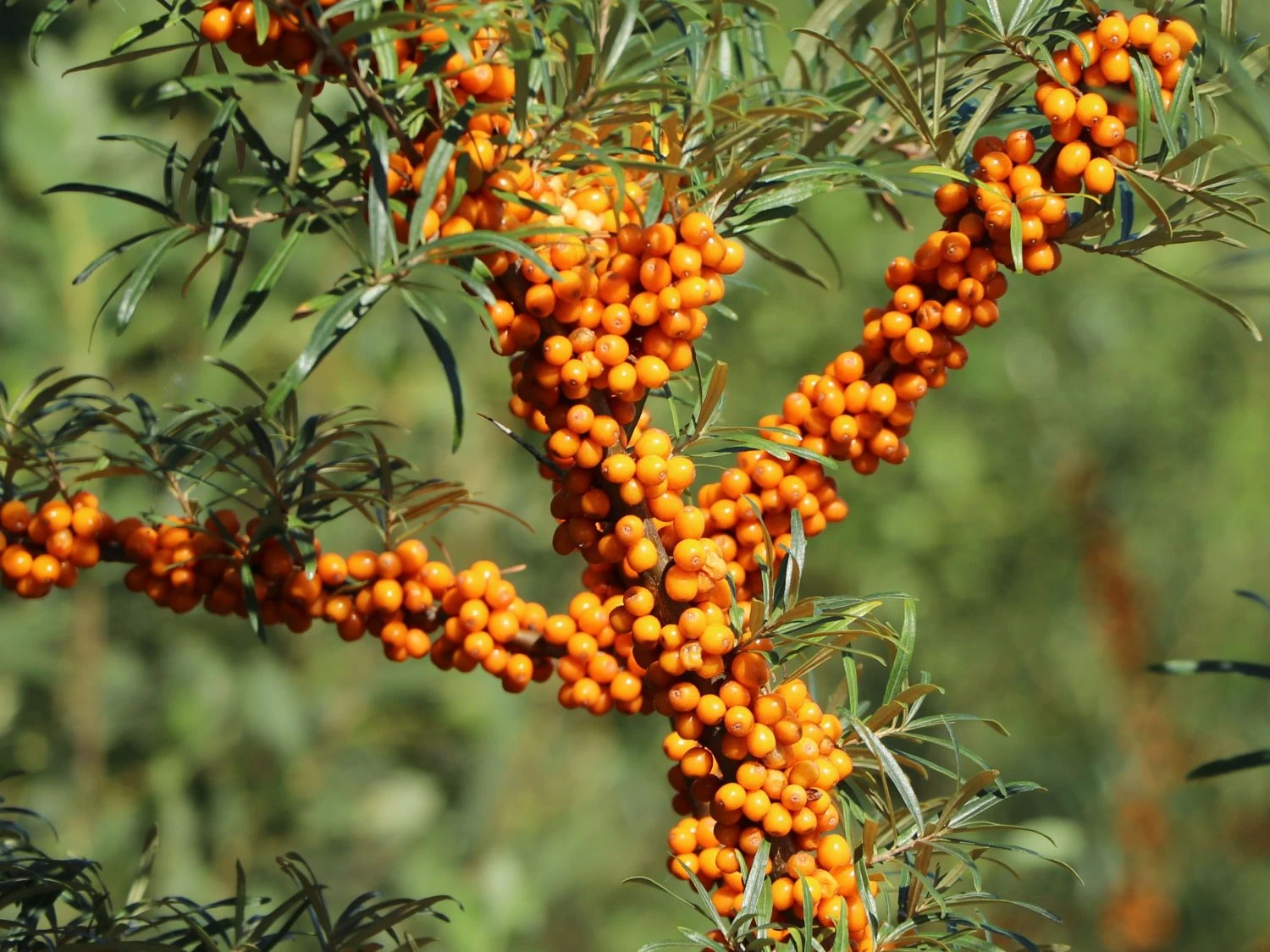 Ein paar Zweige in einer Vase dekorieren den Wohnraum und holen die Natur in die eigenen vier Wände. Zu den weiteren wundervollen Eigenschaften dieser Pflanze gehört der geringe Anspruch an Pflege und das winterharte und robuste Wesen. Bei der Wahl des Standorts, achtet der Gärtner auf einen Bereich in der Sonne oder im Halbschatten. Im vollständigen Schatten ist ein eingeschränkter Wuchs und eine geringere Blüten- und Fruchtbildung zu erwarten. Hippophae rhamnoides ‚Orange Energy‘ ® ist ein wunderschön in der Nähe einer Terrasse. Durch seine Wuchshöhe spendet er einen angenehmen Schatten und zaubert ein mediterranes Flair in den Garten. Nur während länger andauernder Trockenphasen hilft der Gärtner mit Wassergaben. Staunässe verträgt der der Sanddorn ‚Orange Energy‘ ® nicht. Deshalb ist er ein guter Kandidat für Hanglagen. Um Früchte zu tragen, benötigt diese weibliche Variante des Sanddorns einen Befruchter in der Nähe. Ohne einen männlichen Begleiter, der im gleichen Zeitraum blüht, bilden die unbestäubten Blüten des Sanddorns ‚Orange Energy ® keine Früchte. Die wichtige Aufgabe des Bestäubens übernehmen Bienen und Hummeln. Sie stürzen sich mit Eifer auf ihre Aufgabe und erfreuen sich an den schönen Blüten.