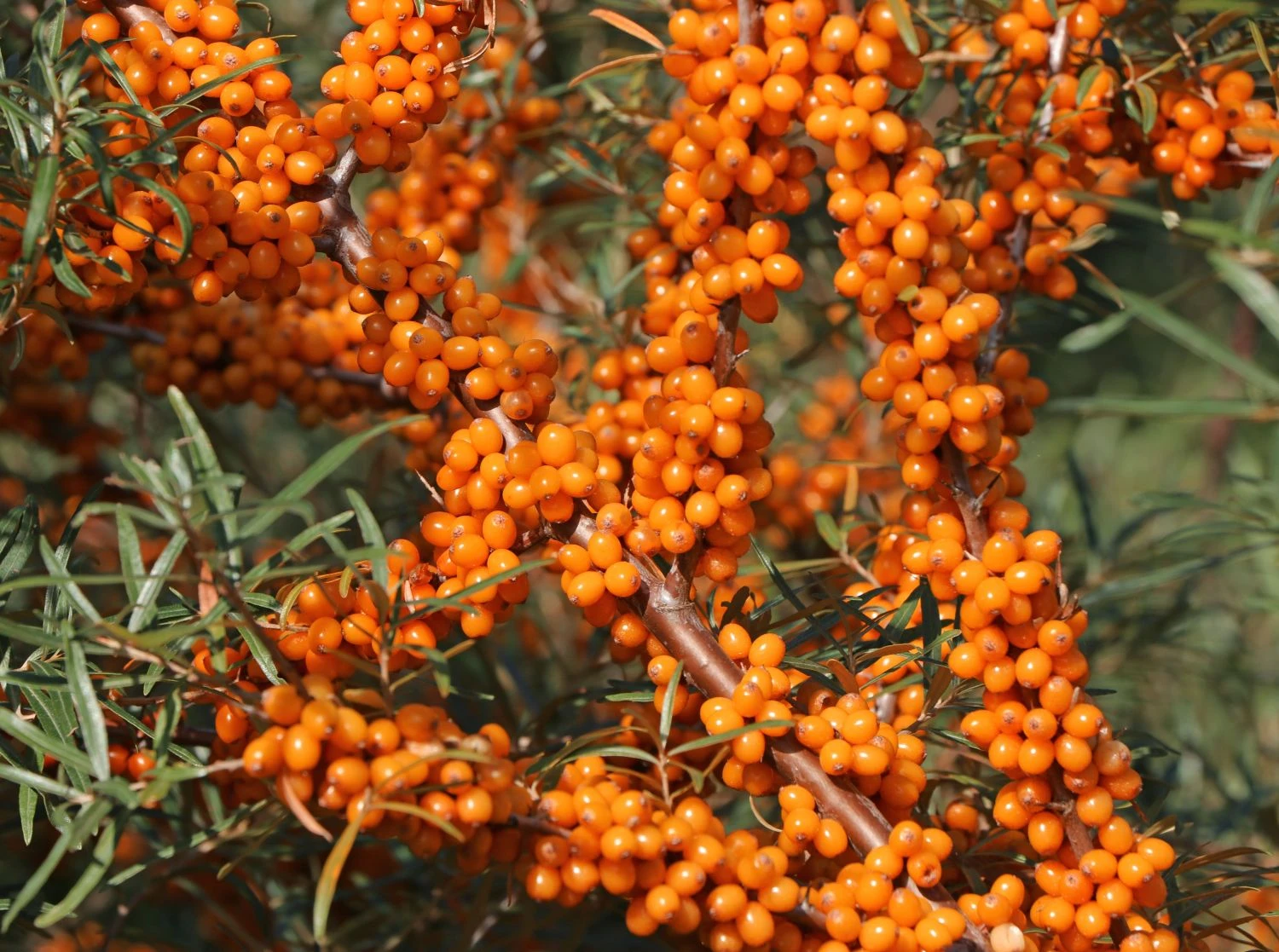 Der Sanddorn weiblich ‚Askola‘ (S) bringt unzählige oval bis walzenartig geformte Früchte hervor. Sie sind extrem vitaminhaltig und die ertragreiche Pflanze bietet extrem vitaminhaltige . Gerne in der Sonne bis im Halbschatten stehend, ist (bot.) Hippophae rhamnoides ‚Askola‘ (S) mit einem sandigen oder normalen Gartenboden zufrieden. In der Blütezeit zwischen März und April bilden sich grünlich-braune Blüten. Aus ihnen bilden sich die unzähligen orangen, gesunden und leckeren Früchte. Die Erntezeit für die Beeren ist in der Zeit von Ende August bis in den September hinein. Stark und locker aufrecht wachsend, erreicht der sommergrüne Sanddorn eine Höhe von vier bis fünf Meter. In der Breite rechnet der Gärtner mit zwei bis drei Meter. Bei einem jährlichen Zuwachs von 30 bis 50 Zentimeter, nimmt er schnell an Größe zu. Diese Sorte benötigt einen männlichen Befruchter, um Früchte zu bilden. Hier ist die Sorte ‚Pollmix‘ eine geeignete Sorte. Ab dem dritten Standjahr liefert ‚Askola‘ (S) größere Erträge. ‚Askola‘ (S) zeichnet sich durch vollkommene Winterhärte aus. ‚Askola‘ (S) bringt ihre mittelgroßen, tieforange gefärbten Früchte in verschwenderischer Vielzahl hervor. Sie sind oval bis walzenartig geformt. Sanddorn wächst vor allem mit seinem weitverzweigten Wurzelsystem im Untergrund. Die Wurzeln strecken sich einen bis drei Meter in die Tiefe. Bis zu zwölf Meter erreichen die Wurzeln nach links und rechts in der Länge. Dicht unter der Erde kriechen die Langwurzeln und verfestigen den Boden. Artfremde Nachbarpflanzen verdrängen sie gerne. Um den Sanddorn weiblich ‚Askola‘ (S) als Zierpflanze einzusetzen, ist eine Rhizomsperre für die Wurzeln von Vorteil.