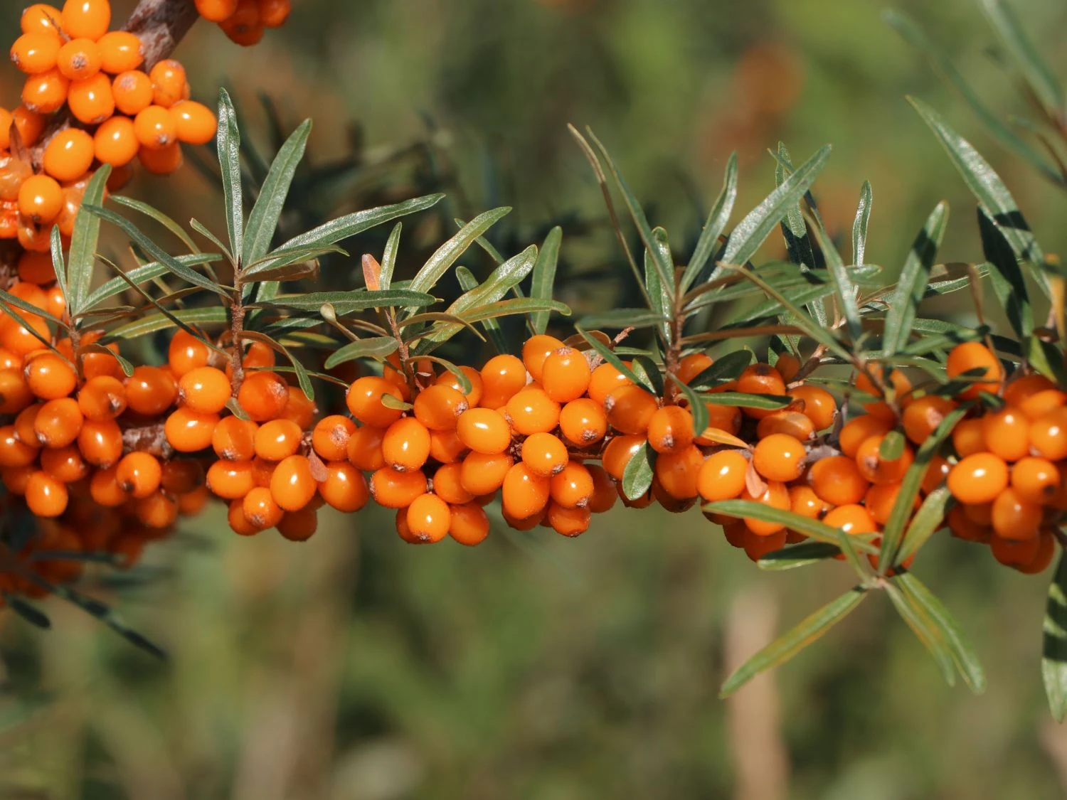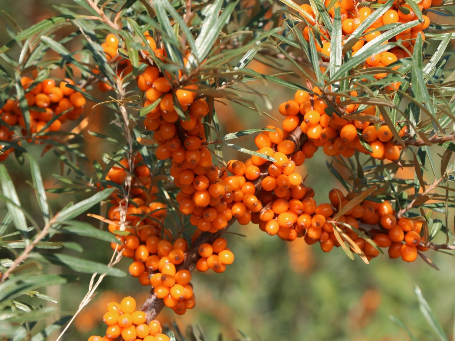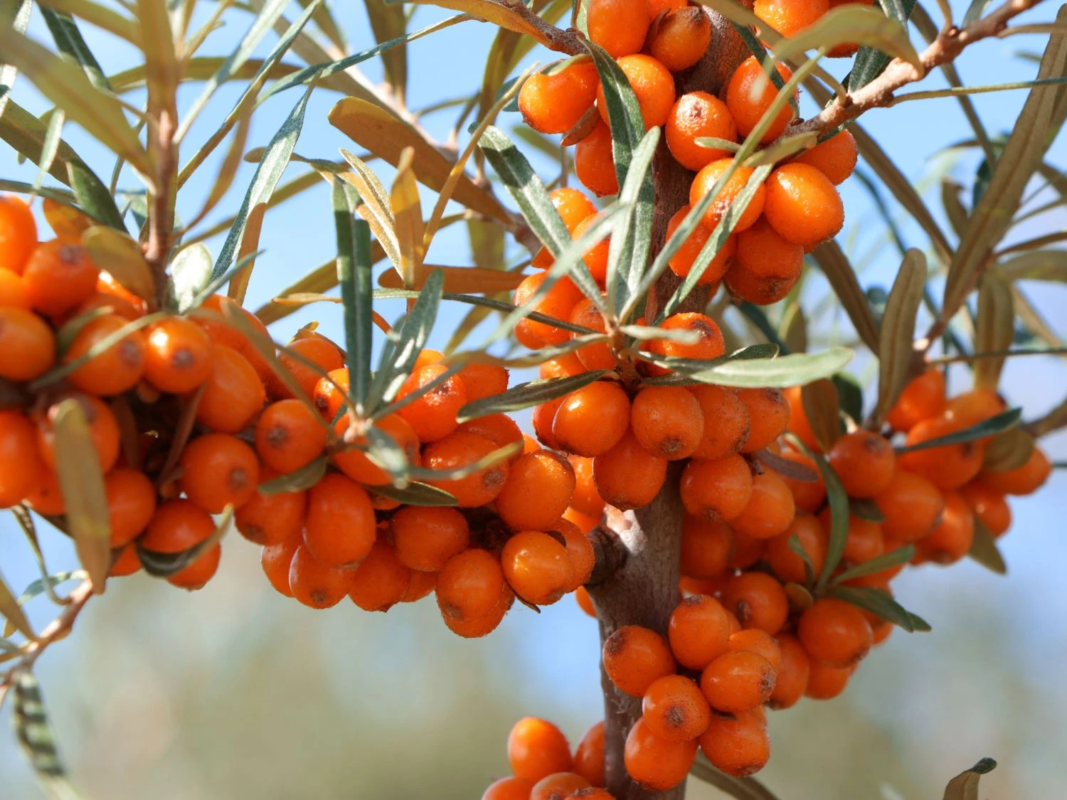 Der Sanddorn weiblich ‚Askola‘ (S) ist eine 1990 in Berlin gezüchtete Sorte. Die ursprüngliche Heimat des Hippophae rhamnoides liegt in Asien und Europa. Der Sanddorn ist sommergrün, breit verzweigt und ist mittelstark bedornt. Die Blätter sind schmal, lanzettartig und in der Farbe silbrig-graugrün. Die unscheinbare Blüte findet im März bis April statt. Zur Ernte sind die vitamreichen, säuerlichen Früchte zum weiteren Verarbeiten bereit. Beliebt sind die Beeren in Form von Likör, Wein, Medizin, Kompott, Marmelade und Gelee. Auch als Naschfrucht eignen sich die orangen Früchte. In Küstengebieten bildet der Sanddorn ein prägendes Bild. Dort sorgt die Pionierpflanze auf unbefestigten und flachen Böden für festes Verankern. Seine typischen Laubblätter ähneln optisch den Blättern der Weide. An einem kurzen Stiel sitzend, sind sie vier bis acht Zentimeter lang und drei bis acht Millimeter breit. In der Form sind sie lanzettlich oder länglich keilförmig. Auf der Blattunterseite sind sie weißlich-filzig behaart. Das Fruchtfleisch von Hippophae rhamnoides ‚Askola‘ (S) ist leicht säuerlich bei einer dünn-breiigen Konsistenz. Das positive Wirken und die heilende Kraft der Inhaltsstoffe des Sanddorns ist durch klinische Studien belegt. Zuständige Institute der ehemaligen DDR forschten im Rahmen einer gesunden Volksernährung an innovativen Erntemethoden, Mutation und Züchtung. Andere Länder sind heute führend in der Kultivierung und im Anbau. Beispielsweise Frankreich auf dem Gebiet der Hohen und südlichen Alpen. Oder die Volksrepublik China, die Anbauflächen von über einer Million Hektar besitzt. Auch aus ökologischer Sicht spielt die Pflanze eine große Rolle. Den ganzen Winter hindurch stehen die Beeren des Sanddorns weiblich ‚Askola‘ (S) zur Verfügung. In dieser schwierigen Zeit sind sie für Vögel eine wichtige Nahrungsquelle. Das Abernten fällt den Vögeln leichter als uns. Zum Schutz vor den langen Dornen, trägt der Gärtner am besten Handschuhe.