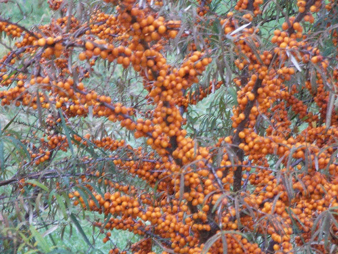 Das Besondere an Hippophae rhamnoides ‚Leikora‘ ist die Blüte vor dem Laubaustrieb. Die Blütenansätze erscheinen am Vorjahresholz. Die Blüten sind gelblich-grün, klein und unscheinbar. Um so beeindruckender sind die sensationellen orange-gelben Früchte, die sich von August bis Oktober daraus entwickeln. Die Sanddornbeeren sind groß und saftig und gesund. Die Beeren sind mit dem hohen Gehalt an Vitamin C richtige Vitaminbomben. Roh genossen, schmecken sie säuerlich. Verarbeitet zu Gelee, Konfitüre und Saft ist das Wildobst eine gesunde Delikatesse. Der Sanddorn weiblich ‚Leikora‘ ist eine späte reich tragende Sorte. Für die Ernte der Beeren sind die kräftigen Stacheln der Zweige zu überwinden. Abschütteln, abstreifen oder einzeln abpflücken, es gibt diverse Methoden. Auf jeden Fall trägt der kluge Gärtner während dieser Arbeit dicke und schnittfeste Gartenhandschuhe. Unsere heimischen Vögel haben es einfacher. Sie vernaschen die Beeren einzeln direkt vom Strauch. Und das mit Vorliebe. Dieser auffällige Strauch wächst verbreitet an den Küsten auf sandigem Untergrund. Wegen seiner ausgeprägten Salztoleranz ist er beliebt an Straßenrändern. Die Beeren von Hippophae rhamnoides ‚Leikora‘ sind an trüben Herbsttagen ein farbliches Highlight. Sie halten ihre intensive Farbe lange und sind in der Floristik für imposante spätsommerliche Sträuße und Gestecke beliebt.