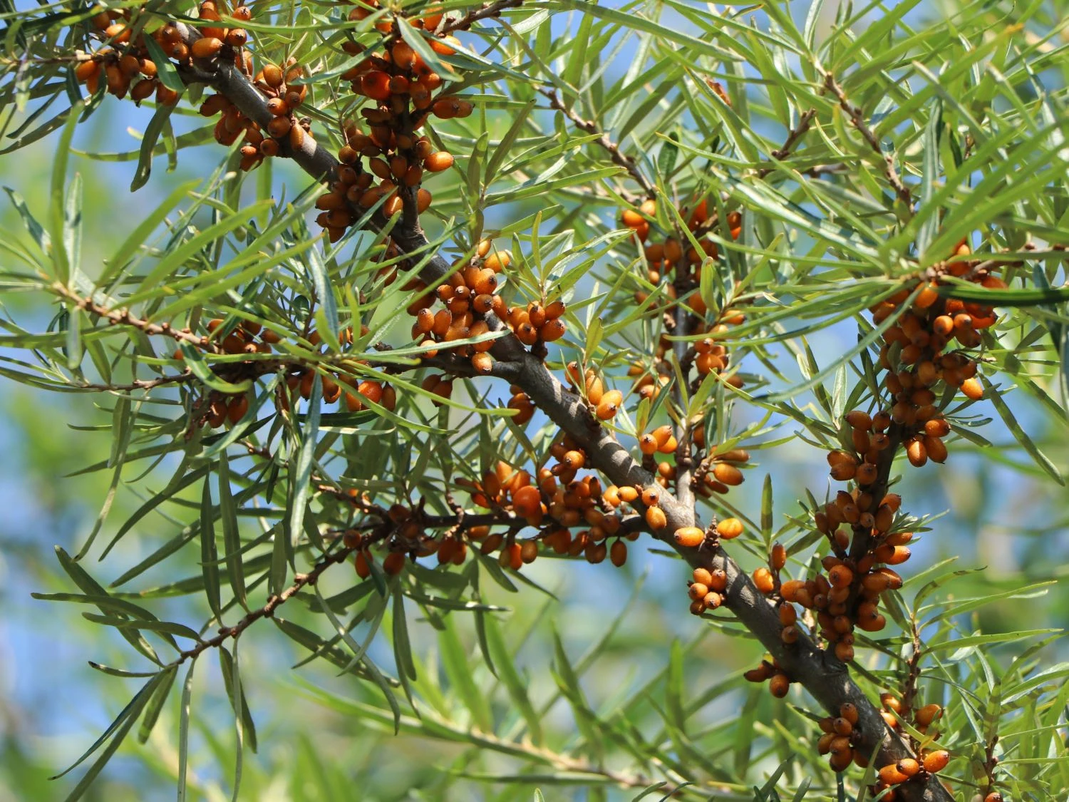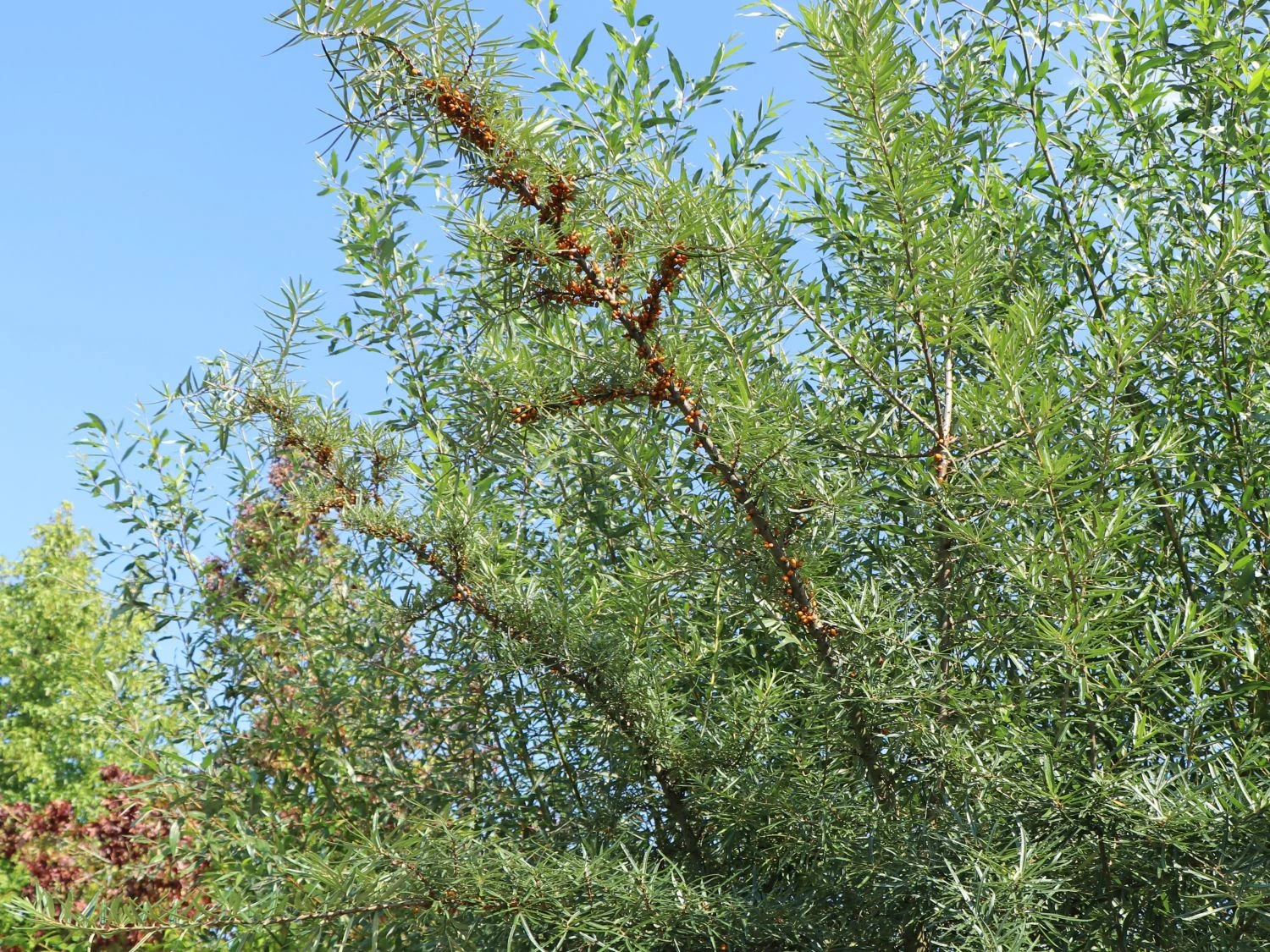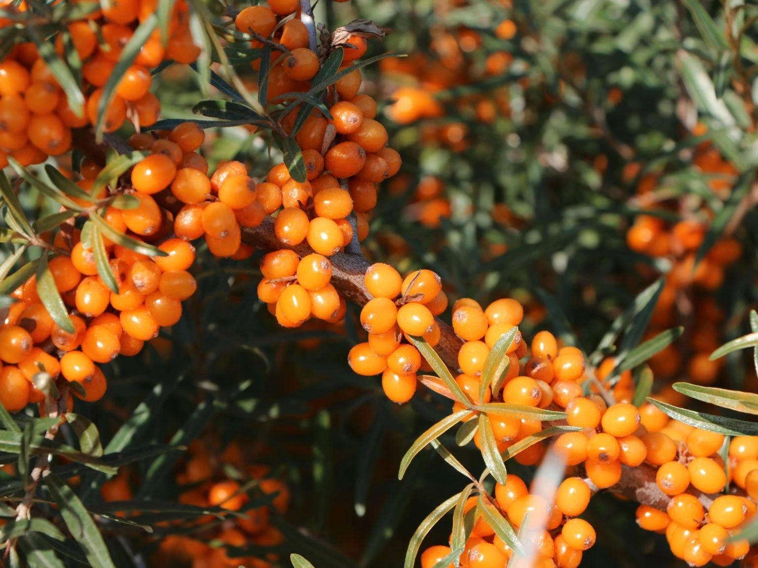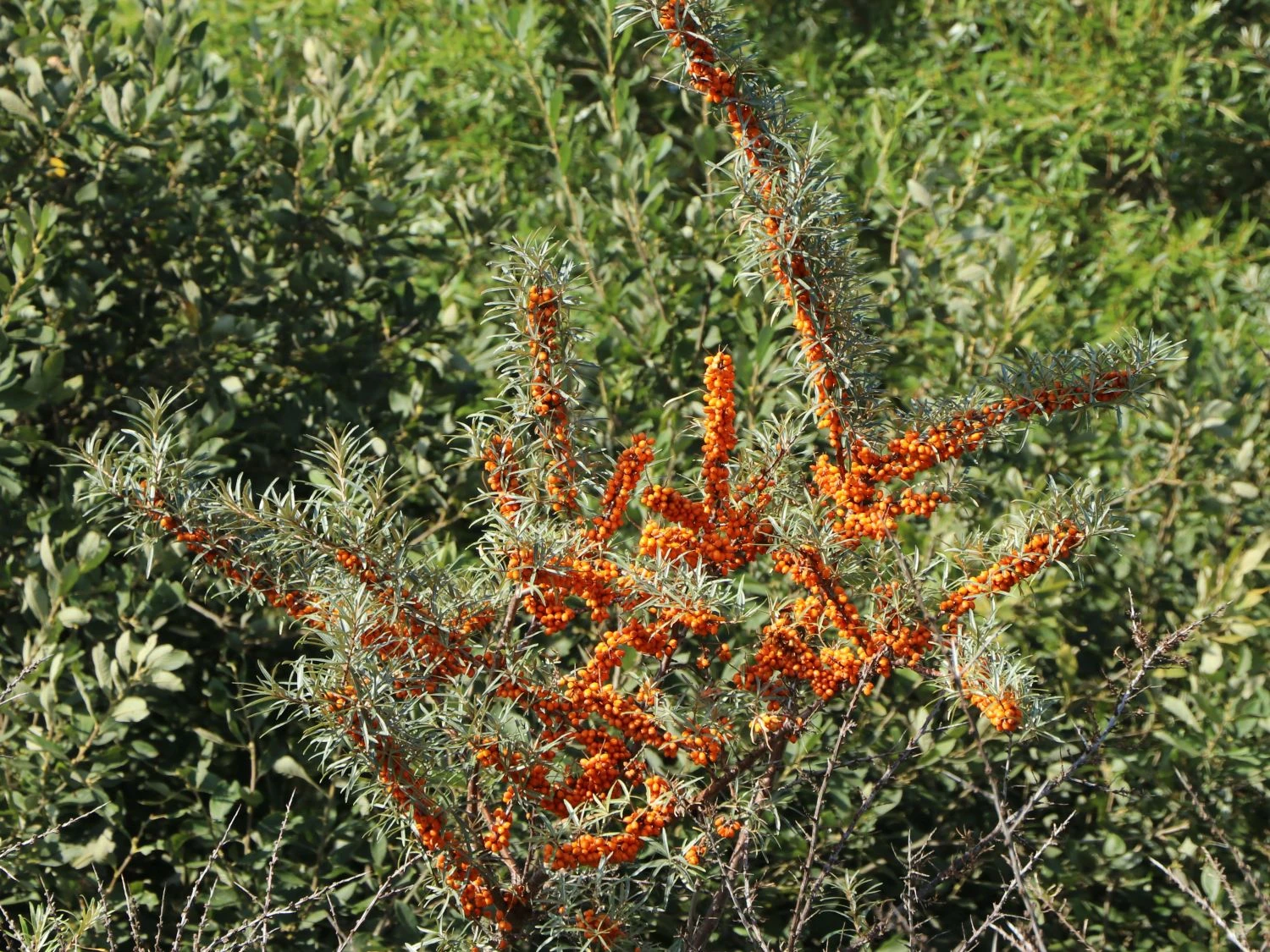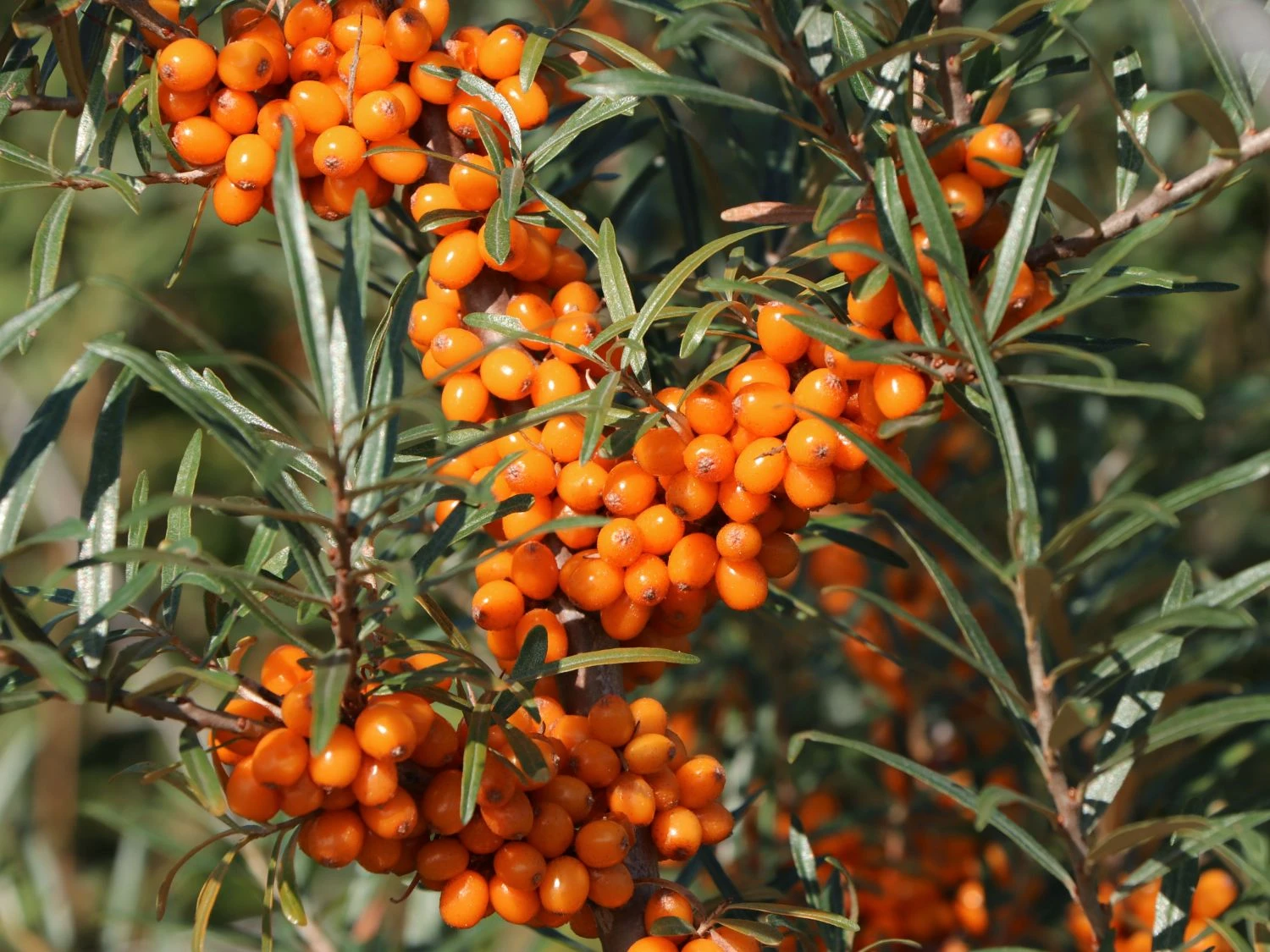 Der Sanddorn zählt zu den Ölweidengewächsen und zeichnet sich vor allem durch sein sonniges Aussehen aus. Die dornigen Äste von (bot.) Hippophae rhamnoides tragen schmale, kurzstielige Blätter und sehr kleine, gelbliche Blüten, die von März bis Mai blühen. Der Sanddorn besitzt ein dichtes Wurzelsystem und ist besonders an Küsten und bergigen Landschaften zu finden. Der Sanddorn wächst sparrig und breit bis zu vier Meter in die Höhe und bildet meist eine unregelmäßige Krone. Aufgrund dieses ausladenden Wuchses ist auf einen ausreichenden Abstand zu anderen Bäumen und Sträuchern zu achten. Neben ihren optischen Vorzügen, ist diese Pflanze unglaublich geschichtsträchtig. Der Sanddorn zählt zu den ersten Pflanzen, die das Ödland nach der Eiszeit besiedelten. Zur Versorgung geht Hippophae rhamnoides eine Symbiose mit Strahlenpilzen ein, von denen er den benötigten Stickstoff erhält.