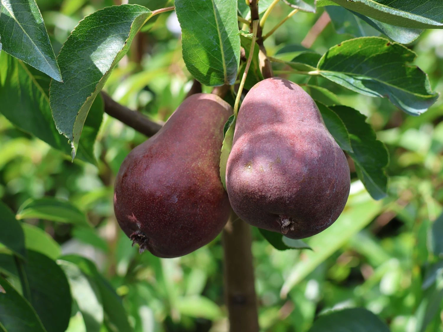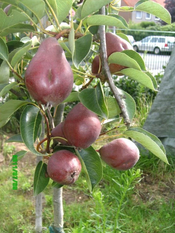 Mit ihrer kräftig roten Schale verführen die mittelgroßen Birnen zum Reinbeißen. Ihr gelb-weißes Fruchtfleisch erfrischt alle Sinne mit seinem fein schmelzenden Geschmack. Die Sommerbirne ‚Rote Williams Christ‘ ist die dunkelrote Form der klassischen Sorte ‚Williams Christ‘. Sie beschenkt den Gartenfreund nicht nur mit ihren wohlschmeckenden Früchten mit vollem Aroma, sondern ist auch optisch ein wunderschöner Blickfang im Garten. Die (bot.) Pyrus communis ‚Rote Williams Christ‘ ist durch ihren aufrechten, breit-buschigen Wuchs gekennzeichnet. Der kleine Obstbaum wächst mittelstark und ist gut verzweigt. Er erreicht eine Höhe zwischen 200 und 400 cm und geht bis zu 300 cm in die Breite. Pro Jahr legt er 20 bis 40 cm zu. Die Laubblätter dieser Birnensorte sind oval bis elliptisch geformt und weisen einen gezähnten Rand auf. Mit ihrer glänzenden, dunkelgrünen Farbe sind sie dekorativ. Die Blätter nehmen im Herbst einen gelben bis orangeroten Farbton an. Zum Winter hin wirft das Gehölz das Laub ab und begibt sich in die Ruhephase. Im Mai erwacht die Sommerbirne ‚Rote Williams Christ‘ erneut und entzückt mit einem Blütenmeer. Die Triebe sind von unzähligen Blütendolden übersät. Sie strahlen in einem reinen Weiß und verströmen einen angenehmen Duft. Bienen und Hummeln dienen sie als bedeutende Nahrungsquelle. Der schönste Schmuck von Pyrus communis ‚Rote Williams Christ‘ sind ihre prächtigen Birnen. Im Laufe des Sommers bilden sie sich aus den Blüten. Sie erscheinen zuerst mit einer glatten, gelblichen Schale, die sich bei Genussreife dunkelrot färbt. Die Erntezeit der leckeren Tafelbirnen liegt zwischen August und September. Direkt vom Baum genossen, sind die Früchte eine willkommene Erfrischung an heißen Sommertagen. Ihr zart schmelzendes, aromatisches Fruchtfleisch ist saftig und süß und zergeht genüsslich auf der Zunge.