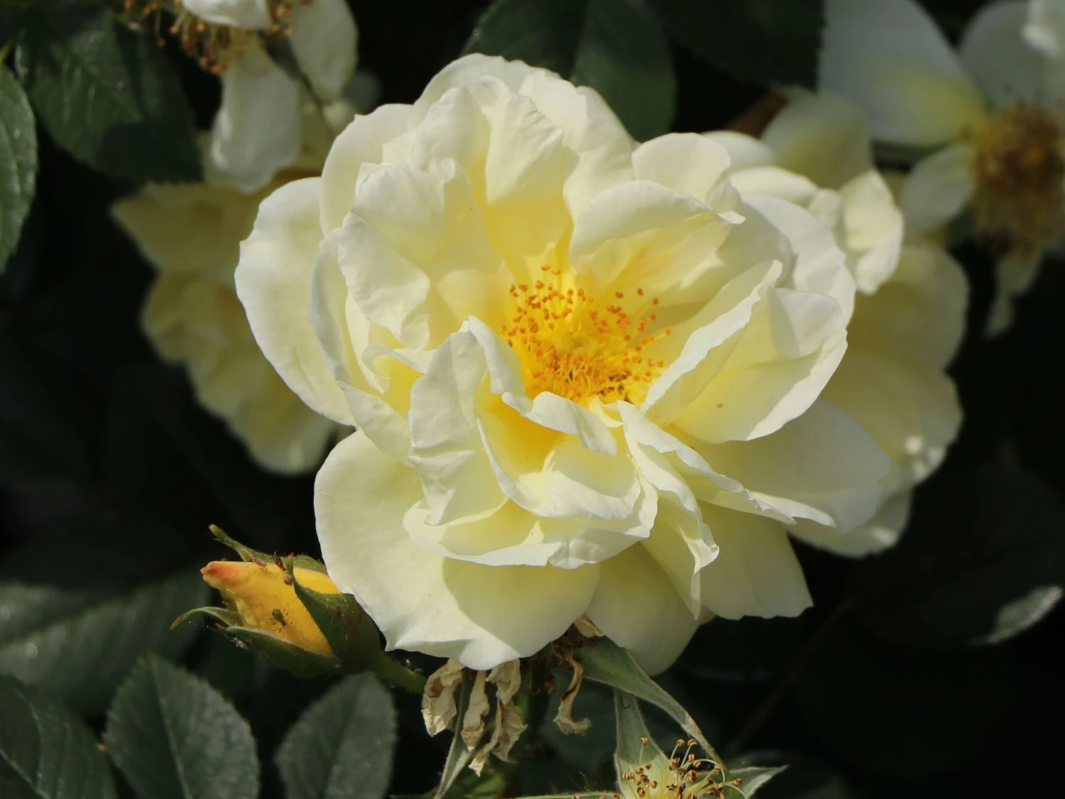 Die gelben, halbgefüllten Blüten sitzen einzeln oder in Büscheln und haben einen angenehmen Duft. Die Pflanze ist eine Flächenrose, frostunempfindlich und salzverträglich.
