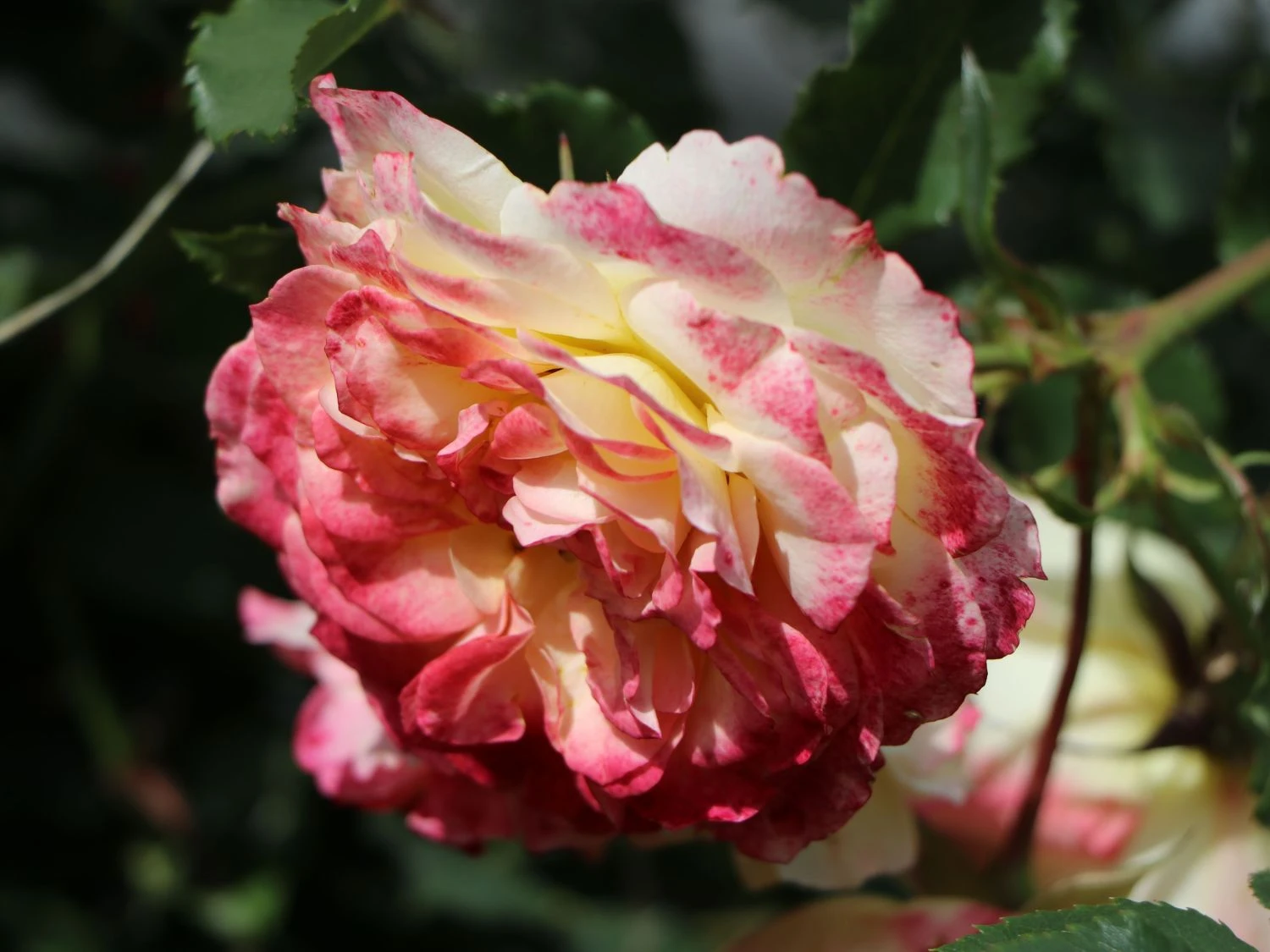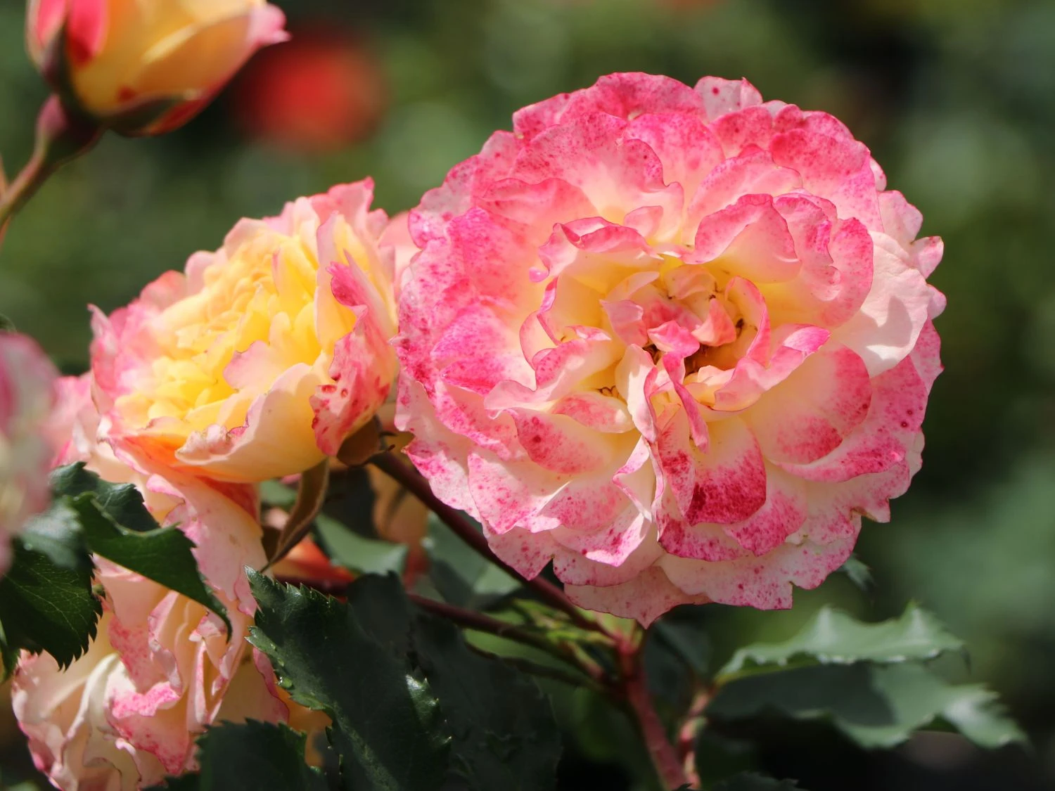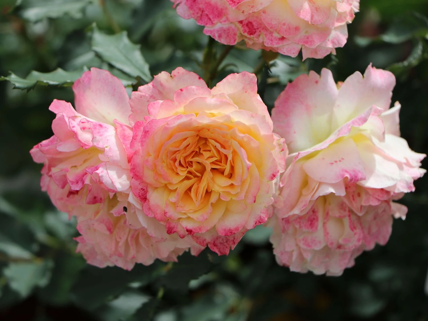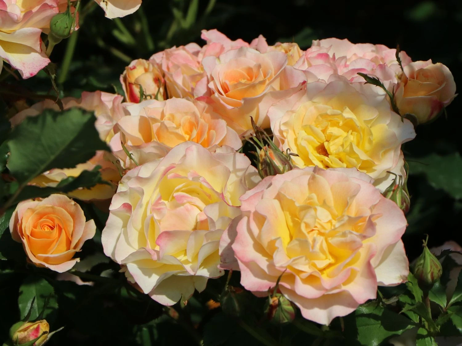 In dichten Büscheln stehend, recken die wunderschönen Blüten ihre Köpfe der Sonne entgegen. Sie schimmern mittig in einem sanften Gelb, die Blütenränder sind mit einem kräftigen Pink überhaucht. Mittelgrüne Laubblätter runden das harmonische Farbenspiel ab. In Gärten und Parks ist die Strauchrose ‚LandLust‘ ® ein wunderschöner, vielseitig verwendbarer Blickfang. Sie ist pflegeleicht und zeichnet sich durch eine gute Blattgesundheit aus. Seit ihrer Einführung im Jahr 2015, erhielt sie mehrere Auszeichnungen. Zu diesen Ehrungen zählen der Publikumspreis Baden-Baden oder das Certificate of Merit Monaco 2016. Rosa ‚LandLust‘ ® ist ein breitbuschig und bogig überhängend wachsender Strauch. Sie erreicht eine Höhe von 100 bis 120 Zentimetern. Ihre maximale Wuchsbreite beträgt 80 Zentimeter. Im Juni entfaltet sie ihre traumhaften Blüten. Die Knospen erscheinen zunächst in einem zarten Gelb. Mit zunehmender Sonneneinstrahlung erhalten sie ihre charakteristischen pinkfarbenen Blütenränder. Die mittelgroßen Blüten sind stark gefüllt und erreichen einen Durchmesser von sieben bis acht Zentimetern. Sie wachsen in reichen Dolden und bilden während der Blütezeit ungebremst neue Knospen aus. Bis in den Oktober verzaubert die Strauchrose ‚LandLust‘ ihre Umgebung mit ihrem prächtigen Flor. Ihre Laubblätter weisen ein kräftiges, glänzendes Mittelgrün auf, das die Leuchtkraft der Blüten perfekt zur Geltung bringt. Sie sind oval, gefiedert und an den Blatträndern gezähnt.