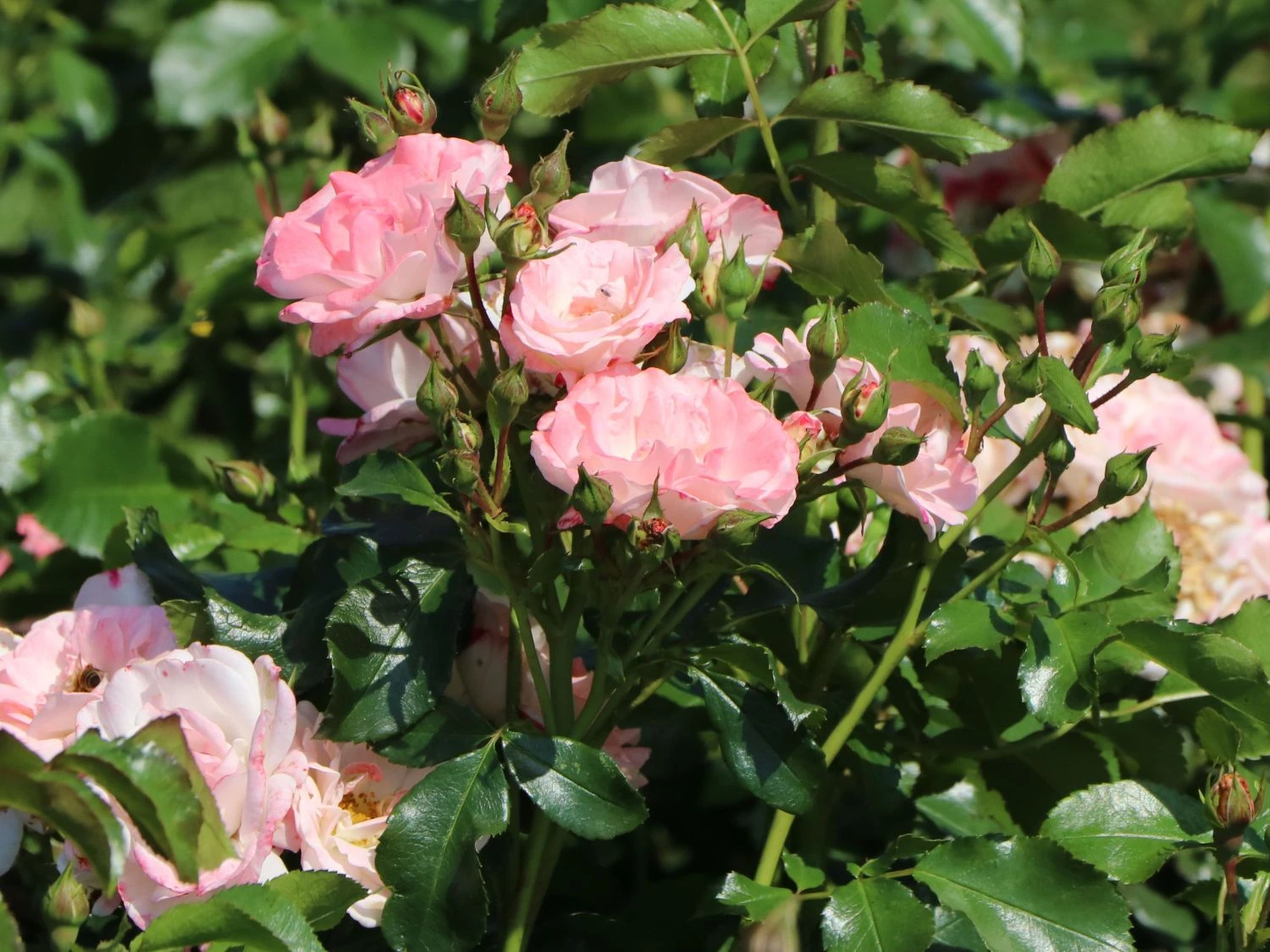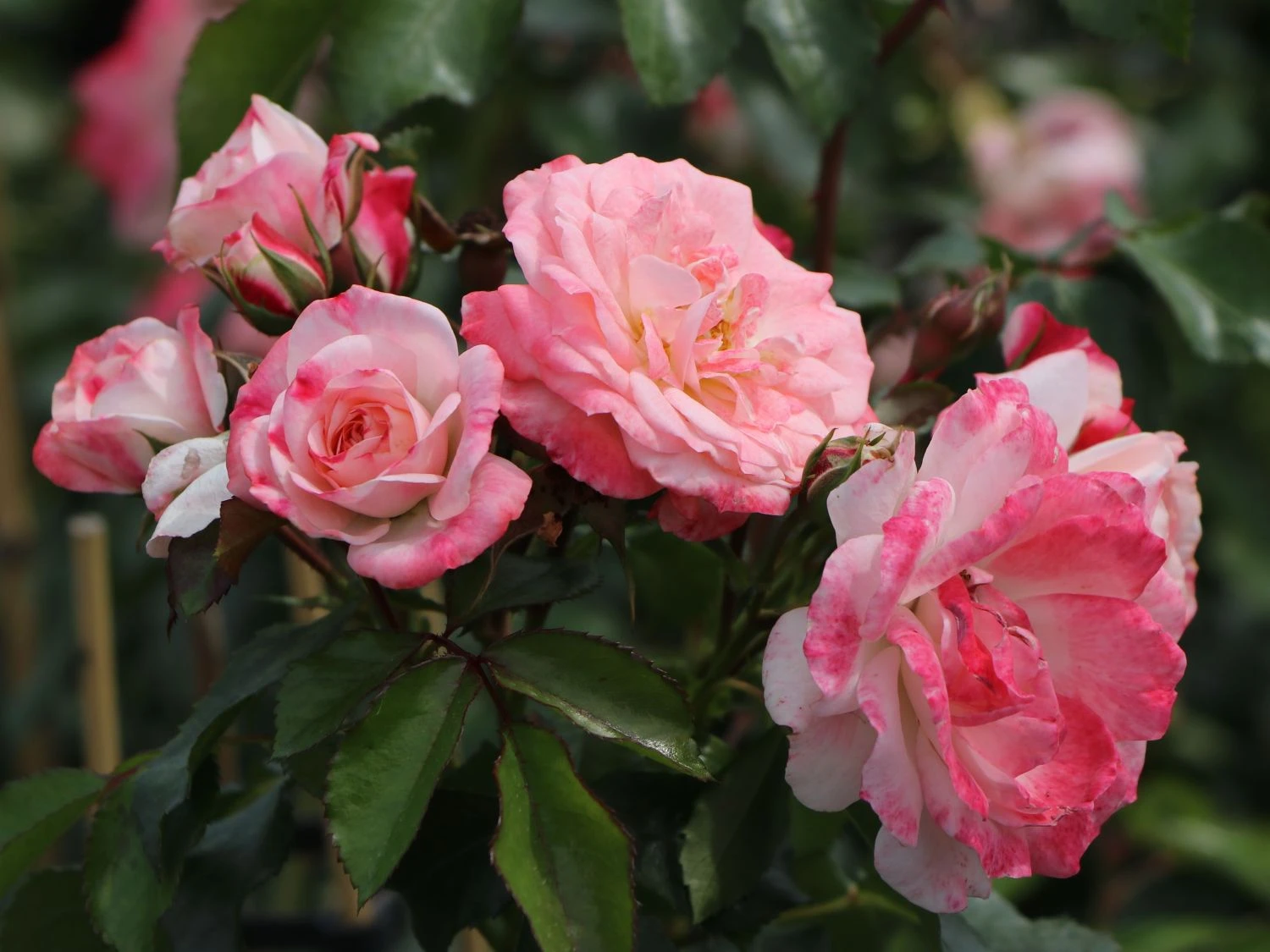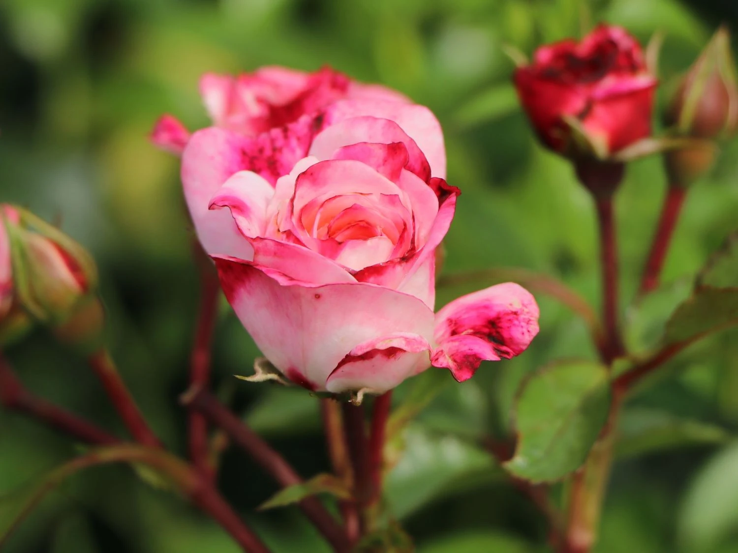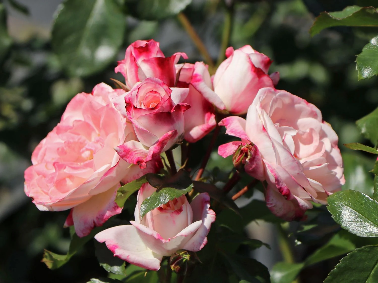 Die Strauchrose ‚Rosenstadt Freising‘ ® / Stad Kortrijk ist frosthart und besticht mit einem bezaubernden Farbspiel ihrer weißen Blüten, die an den Rändern unregelmäßig rot gerändert sind. Die halbgefüllten Blüten mit sind regenfest und duften nicht.