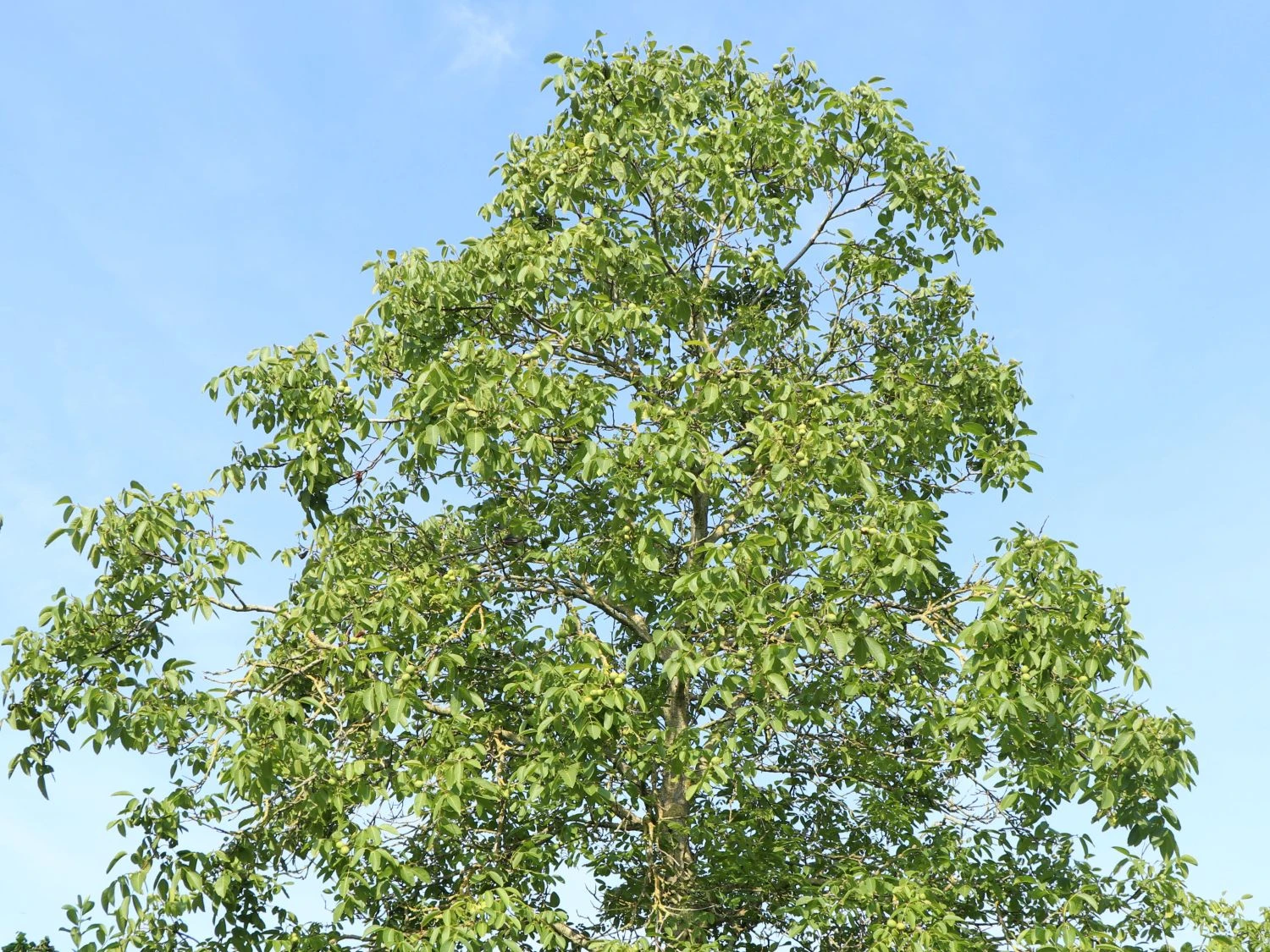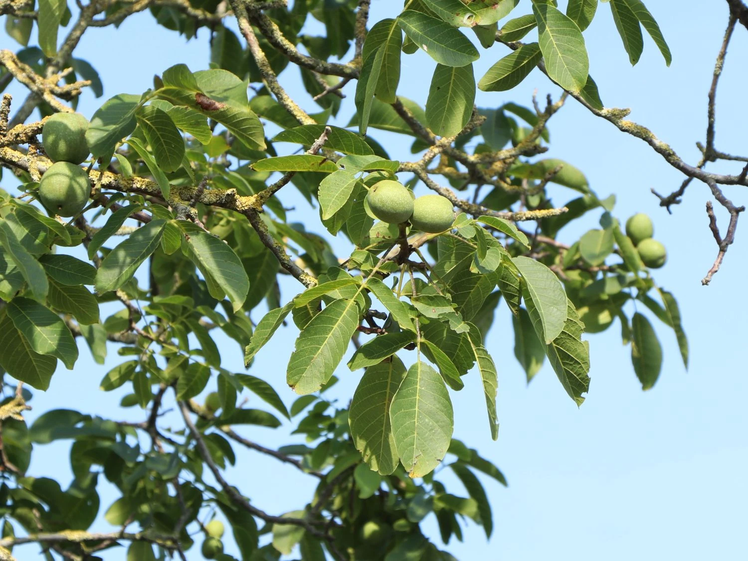 Die Walnuss ‚Klon 1247‘ Veredelung bildet äußerst schmackhafte, milde und mittelgroße Früchte aus. Viele kennen diese Sorte der Echten Walnuss auch unter ihrem weniger sperrigen Namen Kurmarker Walnuss. Sie lassen sich ab September ernten und sehr lange lagern bis zu einem Jahr erfreut sich der Gartenbesitzer an den eignes geernteten Walnüssen. Diese sind gleichmäßig oval und erscheinen mit einer sortenspezifischen Spitze. Die Nüsse von (bot.) Juglans regia ‚Klon 1247‘ Veredelung füllen die komplette Schale aus und sind gesunde Leckerbissen. Voll mit Vitaminen, Magnesium, Eisen, Kalium und ungesättigten Omega-3-Fettsäuren. Hervorragend machen sie sich als Topping auf Salaten oder als köstliche Zutaten von Kuchen, Torten und anderem Gebäck. Die Walnuss ‚Klon 1247‘ Veredelung braucht für einen guten Ertrag keine anderen Pflanzen als Befruchter im Garten, denn sie ist selbstfruchtend. Als Solitär macht dieser Baum Eindruck auf einer freien Rasenfläche vor dem Haus. Tatsächlich ist es nötig, der Walnuss ‚Klon 1247‘ Veredelung genügend Raum zum Ausbreiten zu lassen.