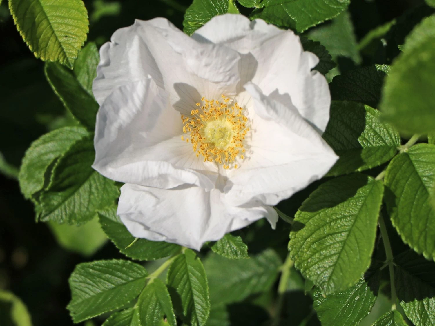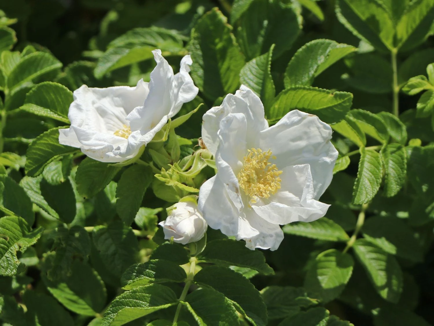 Die Weiße Apfelrose/Kartoffelrose ‚Alba‘ ist eine sehr gesunde und auch widerstandsfähige Wildrose, die mit allen Bodenverhältnissen zurecht kommt. Die reinweißen Blüten erscheinen ab Juni und verbreiten einen schönen Wildrosenduft. Im Juli bilden sich die ersten Hagebutten, die später leuchtend orange / rot werden. Sie verträgt sogar starken Wind und salzige Luft.