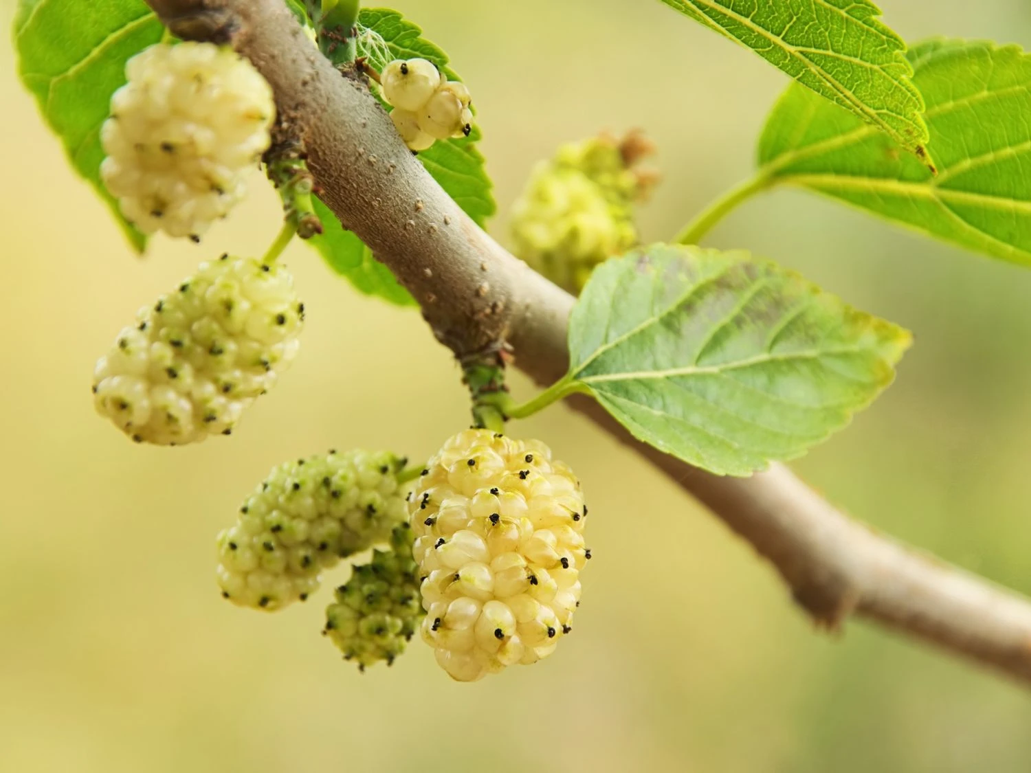 Die Weiße Maulbeere entwickelt Früchte, die wie längliche Brombeeren aussehen. Sie sind essbar, haben eine weiße, lila angehauchte bis schwarze Farbe und einen süßlichen Geschmack, der leicht fade wirken kann. Im Mai/Juni kommen die Blüten zum Vorschein, sie sind aber eher unscheinbar.