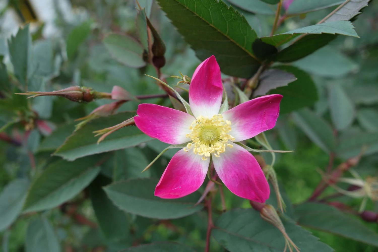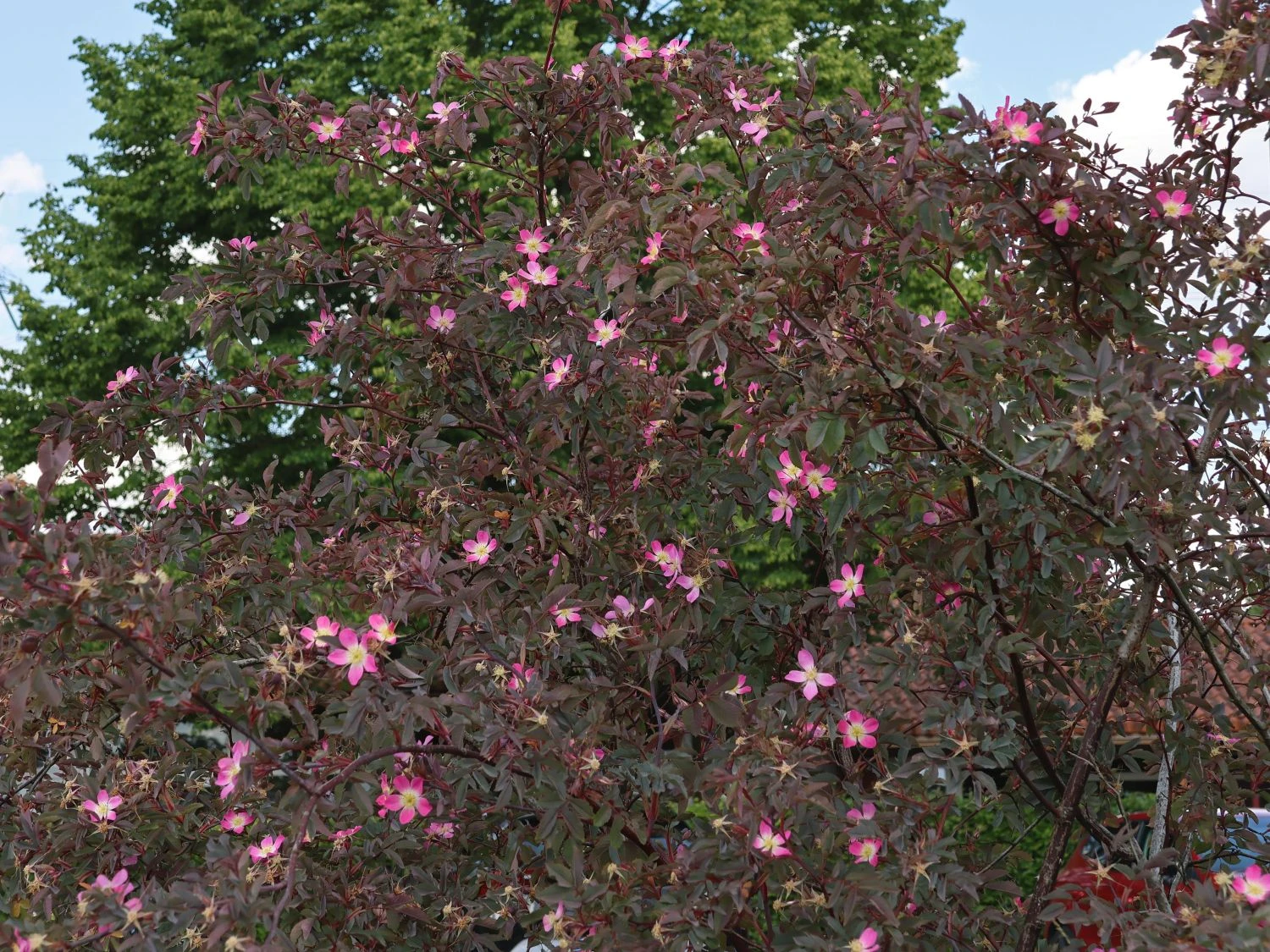 Dieser Einmalblüher ist im Herbst mit zahlreichen mittelgroßen Hagebutten ausgestattet. Mit dem buschig, aufrechtem Wuchs gelangt die Hechtrose / Rotblättrige Rose auf eine Höhe von bis zu 250 cm.