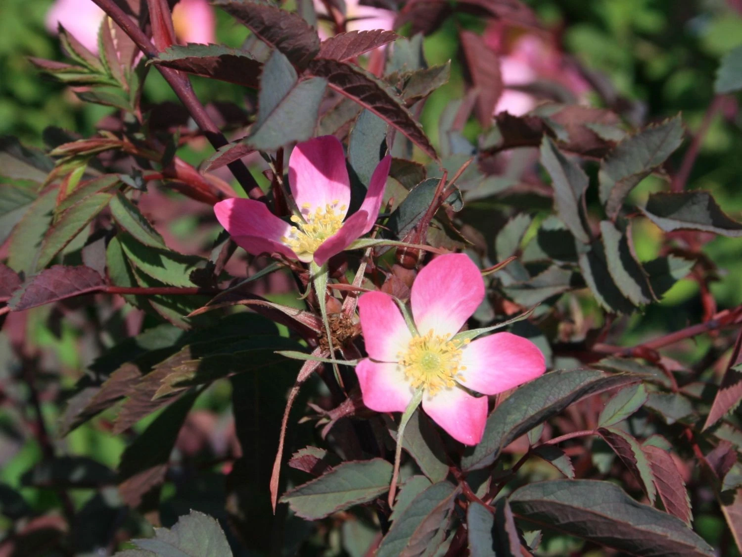 Bei der Hechtrose / Rotblättrige Rose haben nicht nur die Blüten das Sagen bei der Farbe, sondern auch die Belaubung. Die Blätter präsentieren sich nämlich äußerst dekorativ rotgrün, während sich die einfachen Blüten an einen hellen rosaroten Ton halten, der zur Blütenbasis hin immer heller wird.